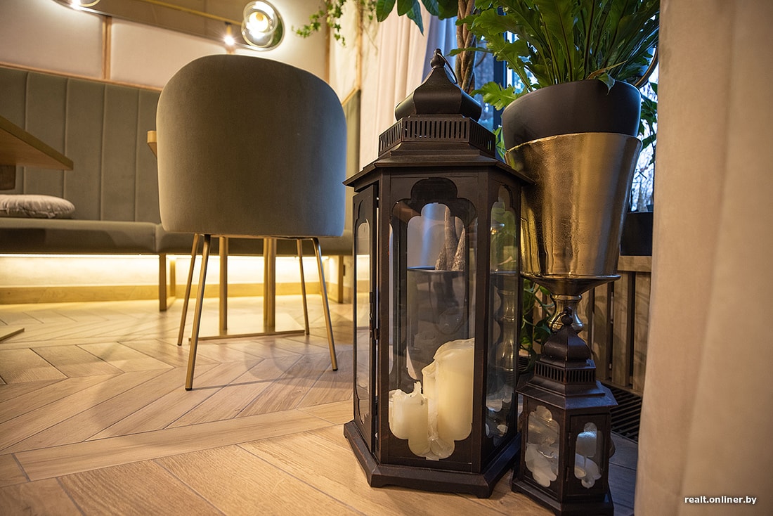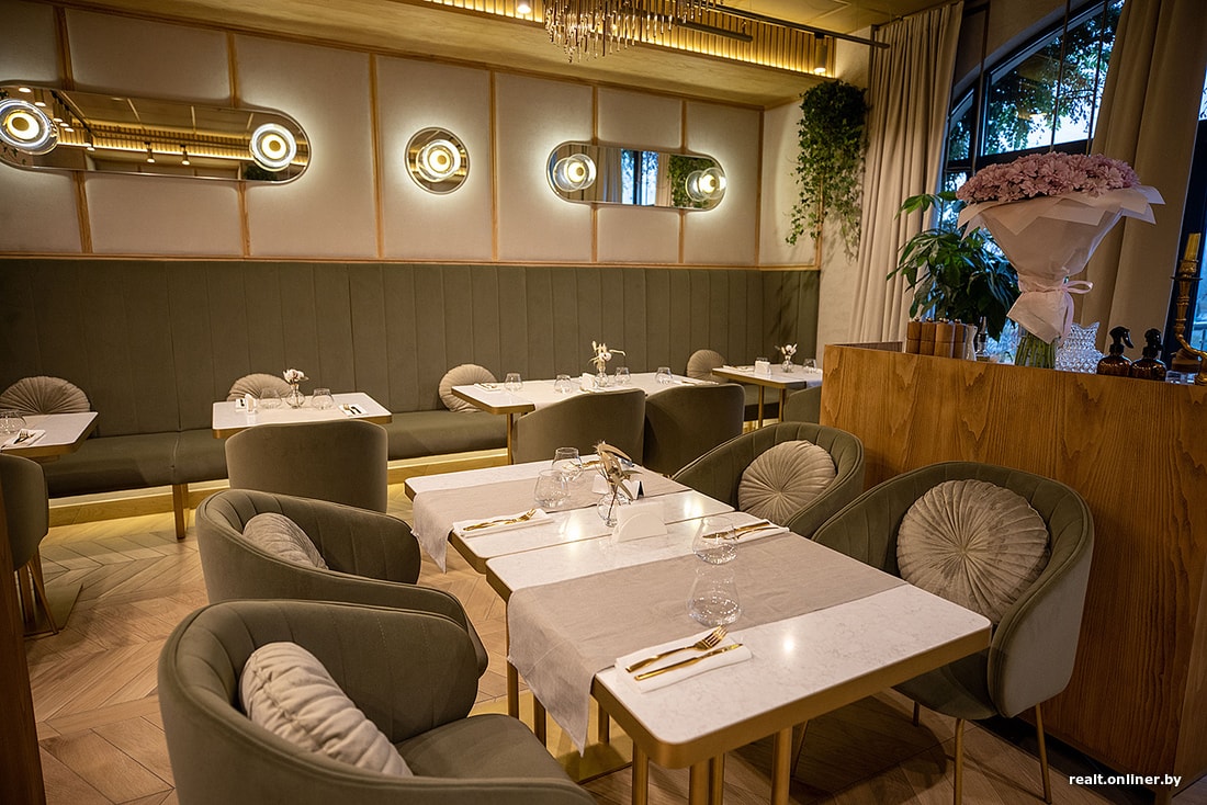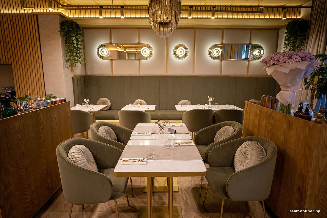 У Bebe красивый вход: такой осенний и меланхоличный. Интерьер напоминает десяток других заведений Минска. Позолота, бархатные диваны, латунные элементы, дерево и зелень — все это мы уже видели, и не раз. Если выбрать место у окна или на диванчике в углублении стены, то вечер пройдет очень уютно. Столы сервированы, как в ресторане.