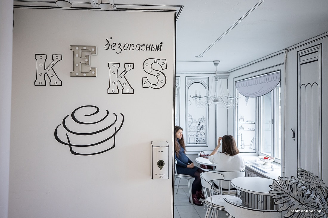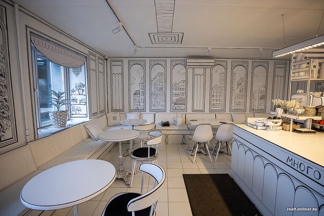 Такие кафешки вы могли видеть, например, в Pinterest. Гугл выдает аналоги в Питере и Сеуле. Весь прикол — в иллюзии, будто ты зашел не в реальное помещение, а в нарисованное. В Минск такие идеи всегда доходят с опозданием, но радует, что доходят.
