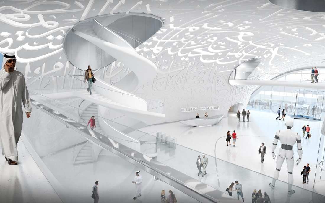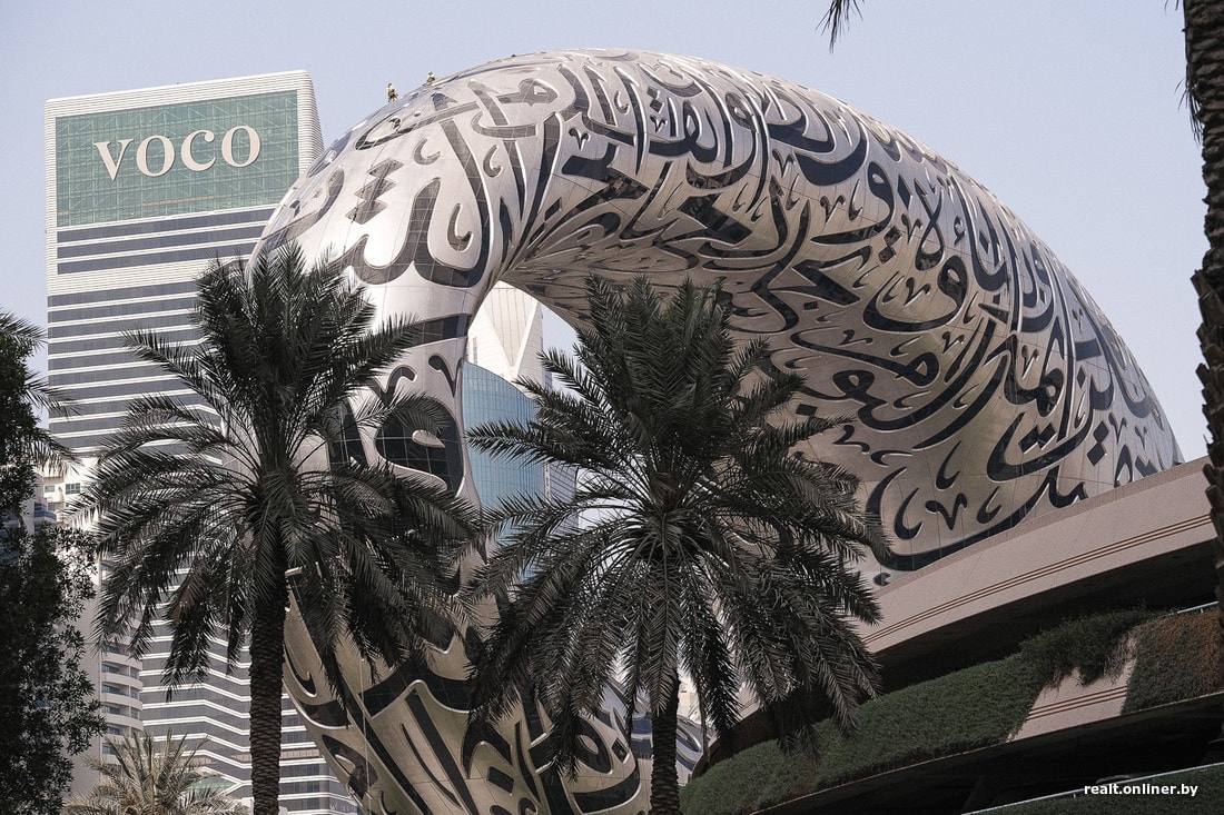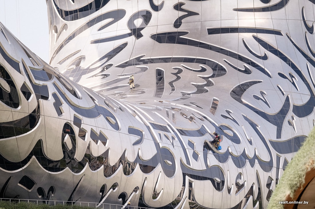 Удивительным аттракционом выглядит и само здание музея. Футуристическая структура, придуманная архитекторами студии Killa Design и реализованная британскими инженерами из Buro Happold, покрыта панелями из нержавеющей стали, а стекло окон между ними образует эффектный паттерн из арабской вязи, складывающийся в стихотворение, которое было написано шейхом Мухаммедом и посвящено будущему его эмирата.