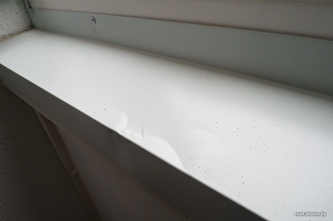 Оконной группе на лоджии тоже досталось: поцарапанный и вогнутый отлив, грязь и порезы на рамах, сколы ручек, зазоры штапиков и пятна на них же. Что-то рабочие уже пытались исправлять, но получилось не очень. Поэтому наш дефектный акт заполняется новыми строчками.