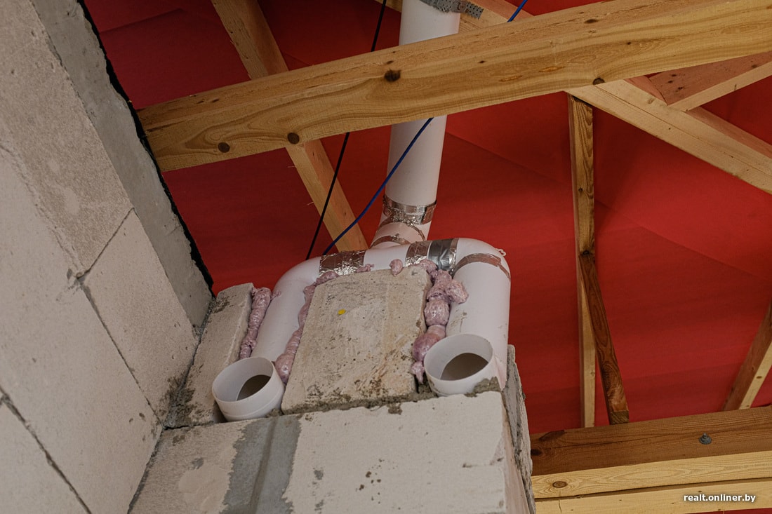 — Вентиляционные шахты по предложению строителя были заменены на пластиковые. И они не будут исправно работать: нет тяги и дренажных отверстий для выхода конденсата, трубы не утеплены. На кухне шахта выступает за край стены, а в гостевом санузле монтаж каналов выполнен с нарушениями — это повлечет за собой перетекание воздуха в другие помещения.