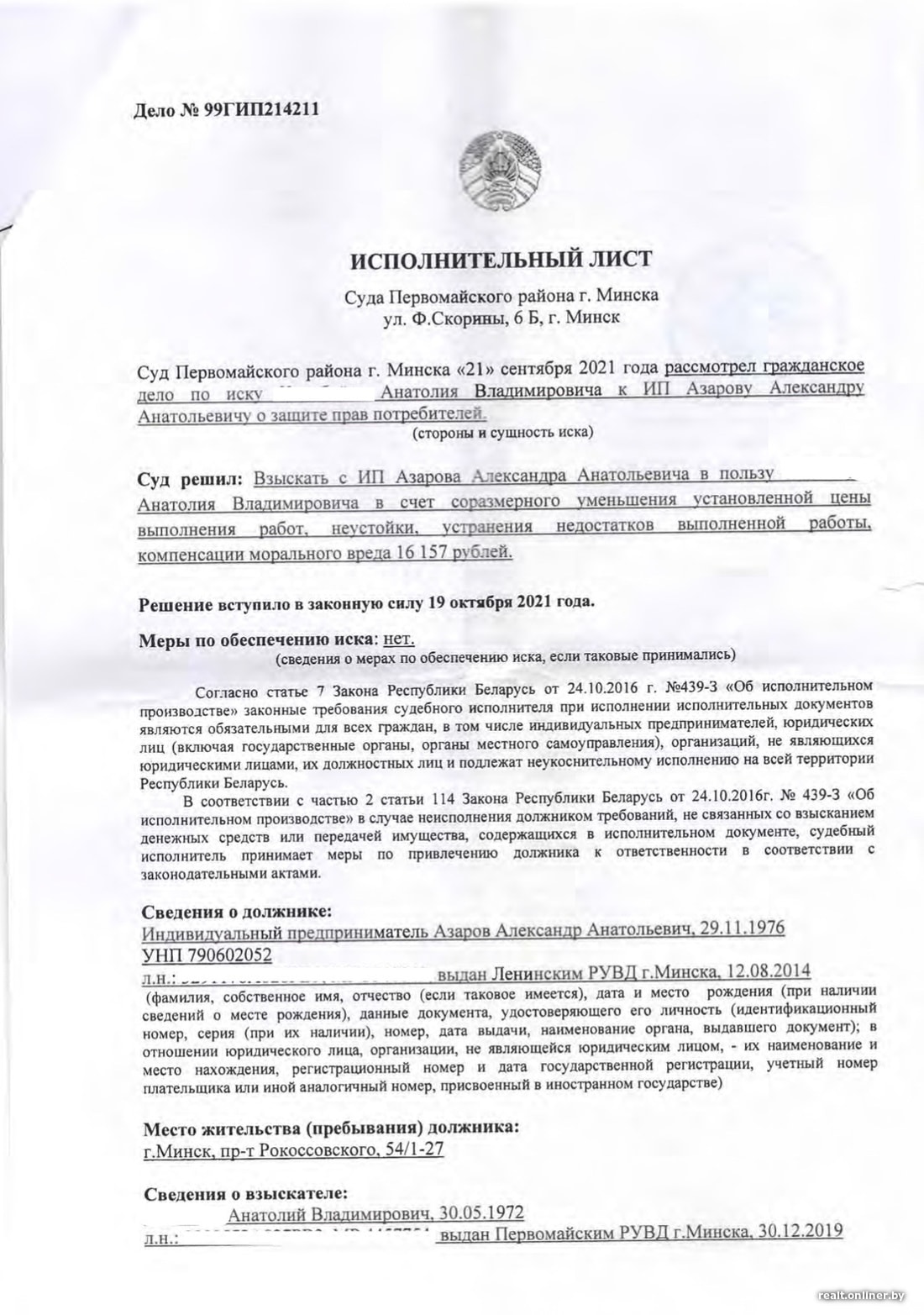 — Когда я получил на руки необходимые документы, тут же поехал в районный отдел принудительного исполнения. Написал заявление с требованием взыскать необходимую сумму с Азарова. Через несколько дней мне пришел ответ: исполнительное производство приостановлено. Причина — указанный УНП числится за другим юридическим лицом, хотя эти реквизиты я брал из заключенного договора!