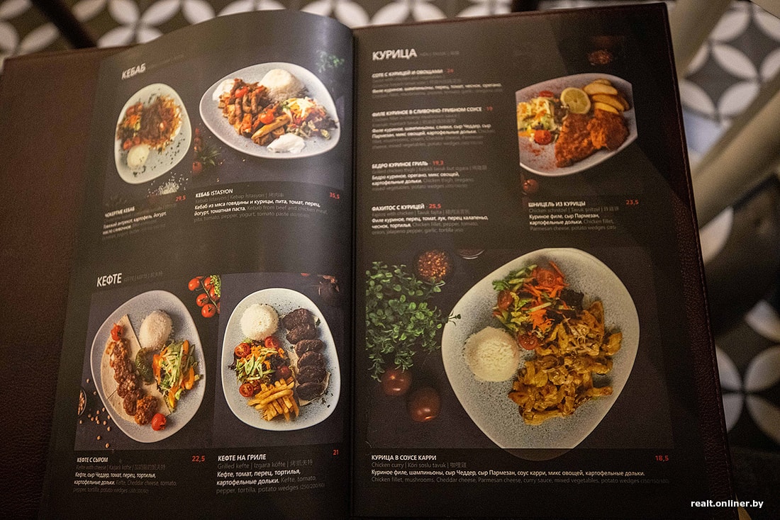 Смотрим меню. В него постарались вместить все возможные кухни: тут и турецкие блюда, и пиццы, и бургеры, и суши, и пасты. Сложно сконцентрироваться на чем-то одном. Цены — слегка выше среднего.