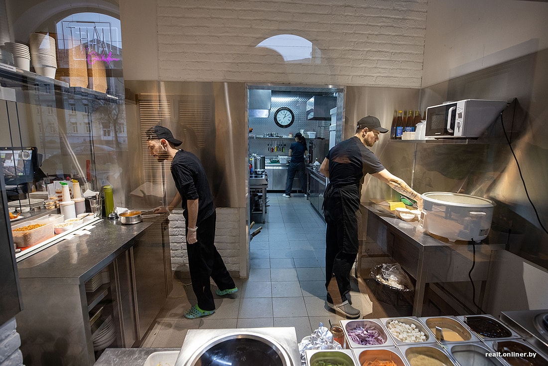 Кухня по традиции — открытая. Вспоминается цитата из интервью пятилетней давности: «Открытая кухня — это здорово применительно к постсоветской действительности. Люди, когда не видят кухню из зала, думают, что в их еду плюют или еще что-то постороннее закидывают. Возможность видеть работу поваров — традиция азиатской кухни. В Азии часто работают с сырыми и свежими продуктами: принесли свежую рыбу — при тебе приготовили и подали».