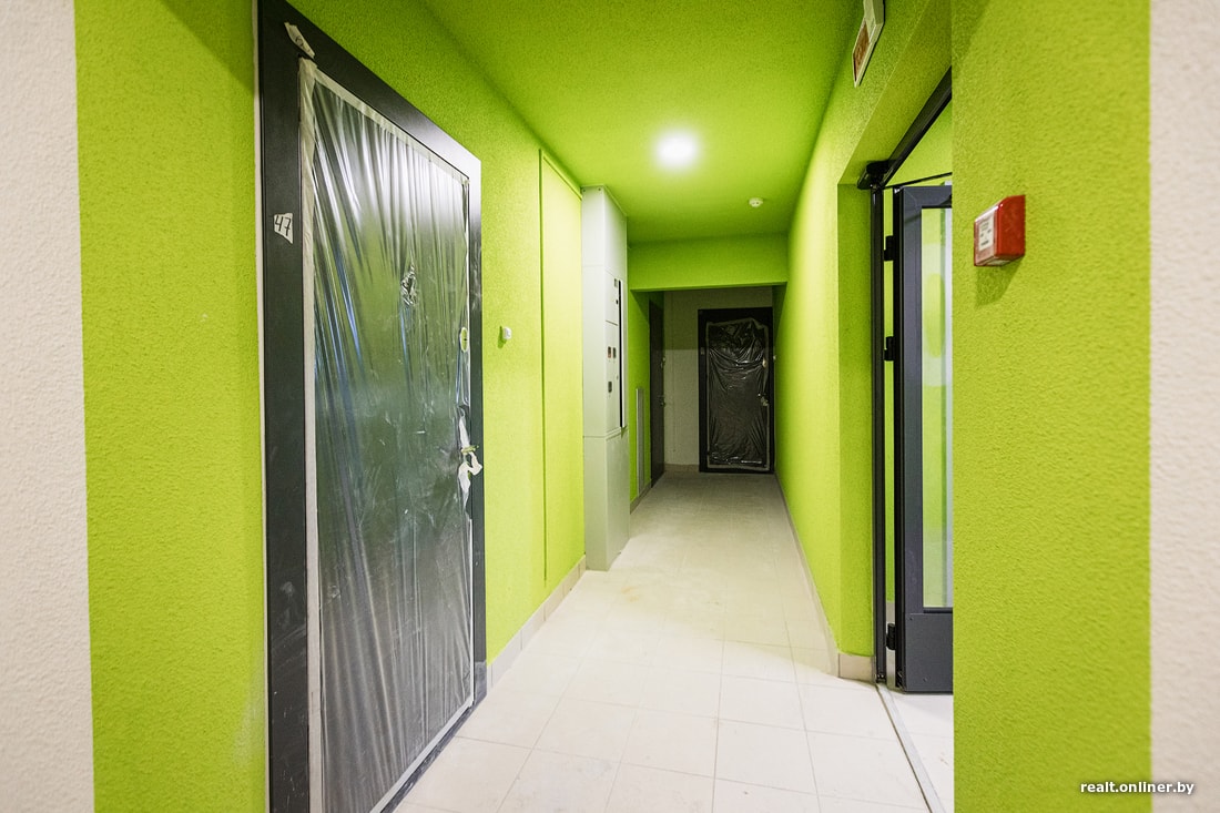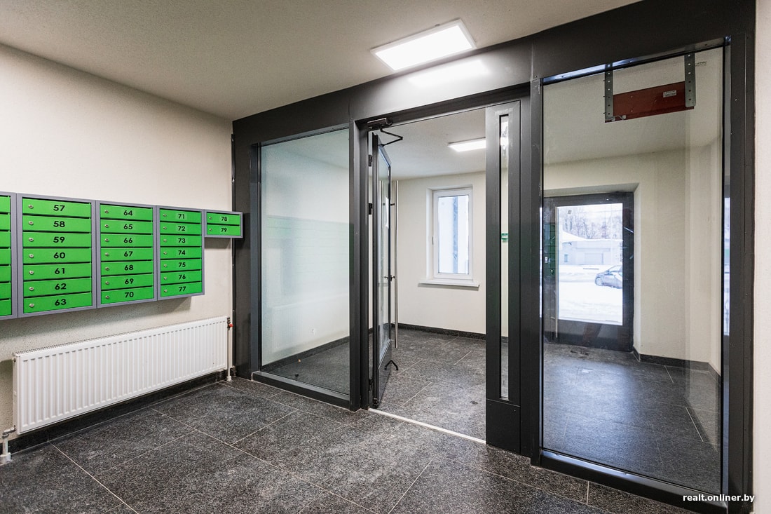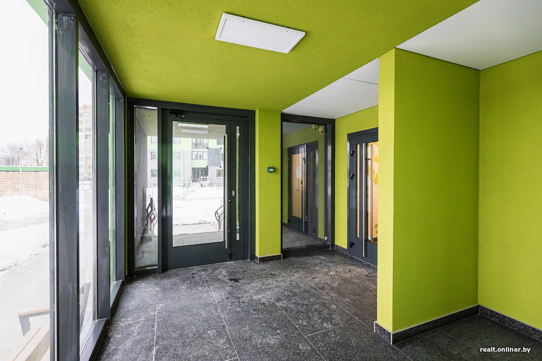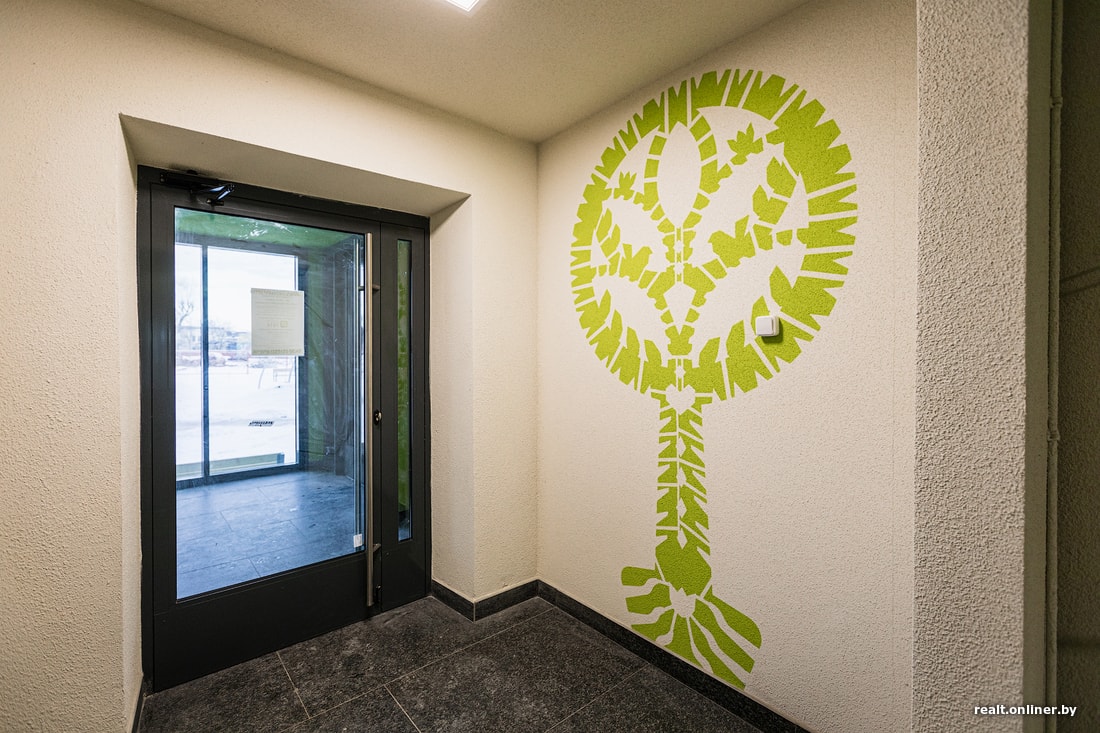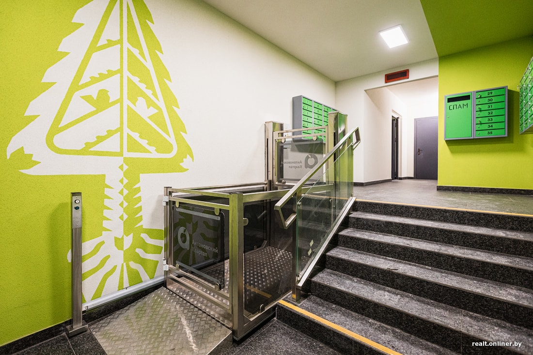 Входные группы высоток стеклянные, в подъездах установлены подъемники для людей с ограниченными возможностями. Дизайн общих зон яркий. Из особенностей: дома проектировались с мусоропроводом, от которого пришлось отказаться. Благодаря этому на каждом этаже появилось по дополнительному уголку для хранения.