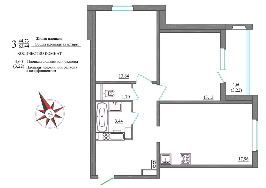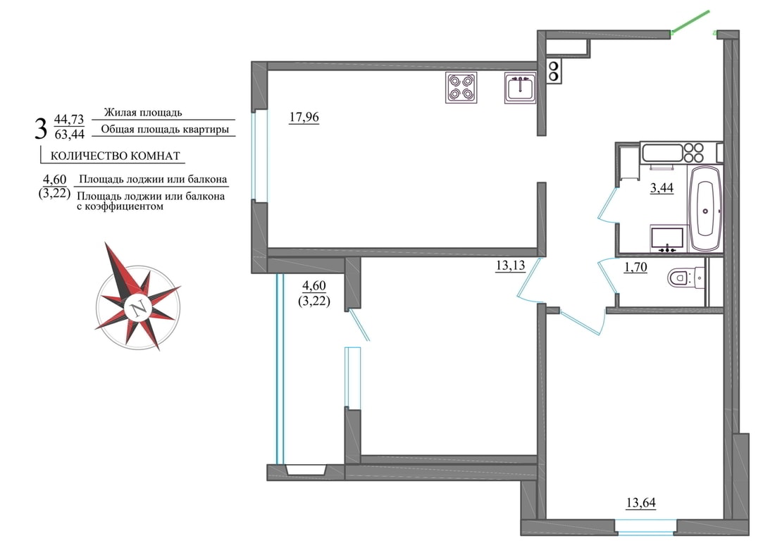 На сегодня в продаже осталось всего семь квартир в готовой 19-этажке. Единственную вакантную евродвушку на первом этаже новостройки можно купить за $57 733 по курсу ($1300 за «квадрат»). Площадь квартиры — 44,41 кв. м, планировка выглядит так: