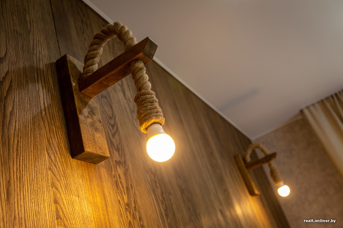 Из интересных решений — ламинат на потолке. К слову, стыки закрывает обычная грубая бечевка.