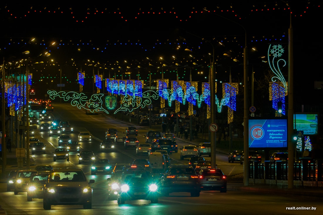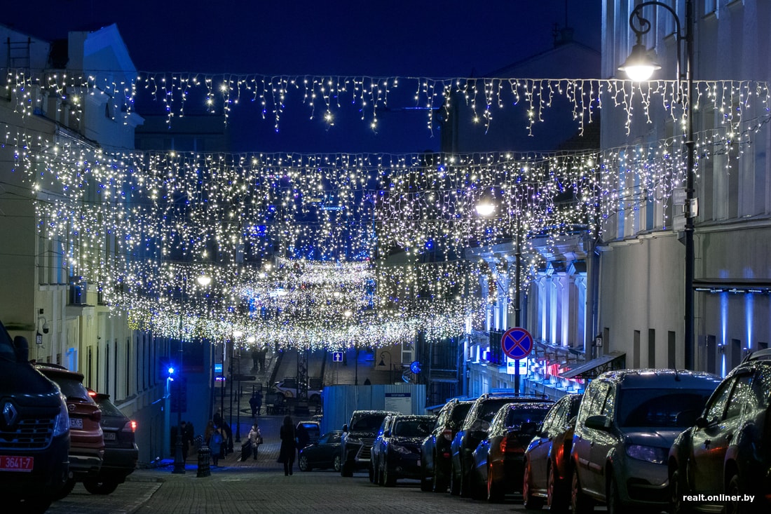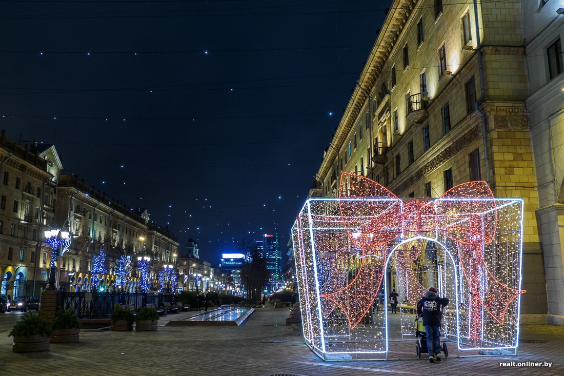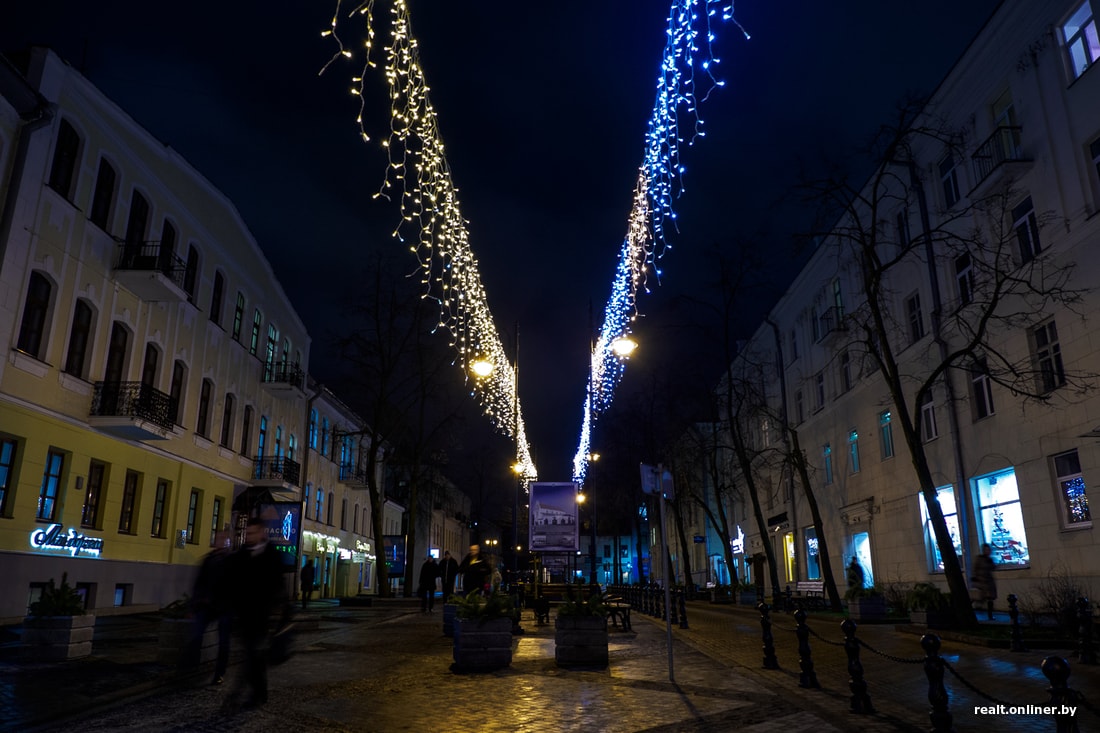 Погода на улице осенняя, поводы — зимние. 15 декабря в Минске включили новогоднюю иллюминацию, и это очень уж прозрачно намекает: 2021-й на исходе. Фотограф Onlíner прошелся по улицам и посмотрел, как выглядит город в огнях.