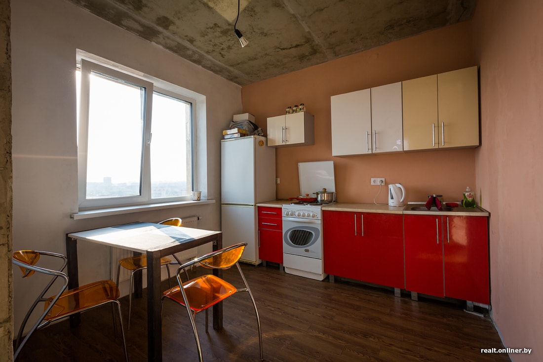 А теперь вернемся на 6 лет назад в съемную квартиру Олега. Тогда герой рассказал Onlíner, что практически не потратился на обстановку: многое сделал своими руками, мебель покупал сильно б/у за 10, 20, 30 долларов. Дороже всего парню обошлись линолеум и старая кухня, за которую пришлось отдать $150 по курсу. Поразительно, но большинство этих вещей нашли место и в новом доме: все тот же старенький (но очень мягкий) диван, самодельные полки из поддонов. Наша старая знакомая — кухня — тоже здесь!