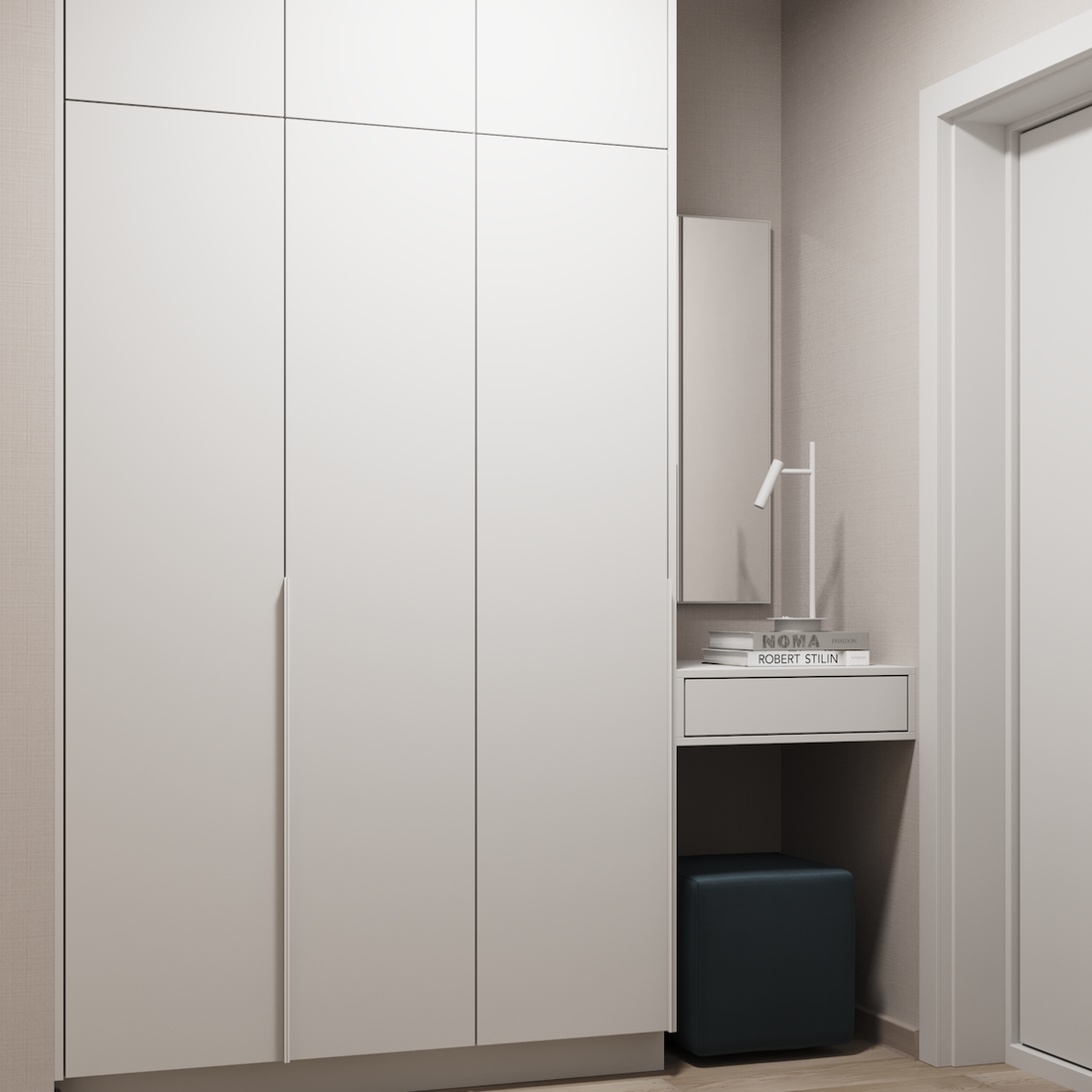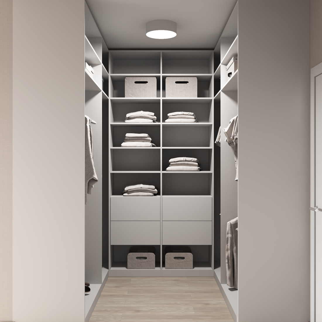 В зависимости от планировки и площади мебельный пакет включает встроенный шкаф с консолью для прихожей, зеркало, пуф, потолочные светильники, оборудованную гардеробную. В гостиной — диван, ТВ-тумба, ковер, журнальный столик, в спальне и детской — кровати с ортопедическими матрасами, шкафы, настольная лампа, прикроватные тумбы или стол.