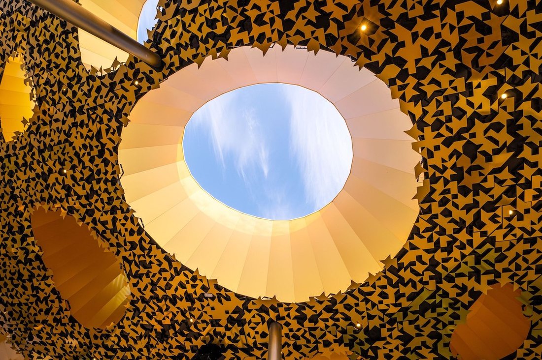Главное в облике Дома музыки — крыша. По задумке архитектора криволинейный профиль повторяет изгибы звуковых волн. В кровле сделана почти сотня проемов: сквозь них растут деревья, а еще проходит много солнечного света. Плюс изнутри на нижней поверхности крыши можно увидеть тысячи желтых «листьев».