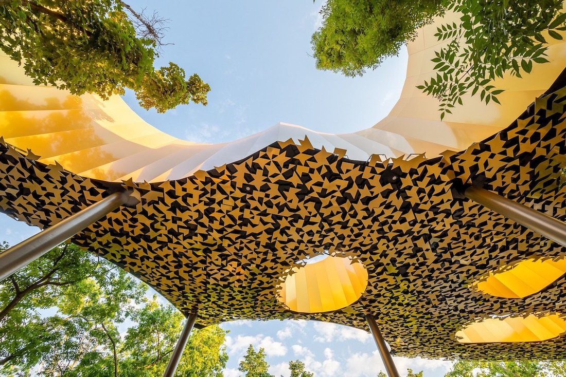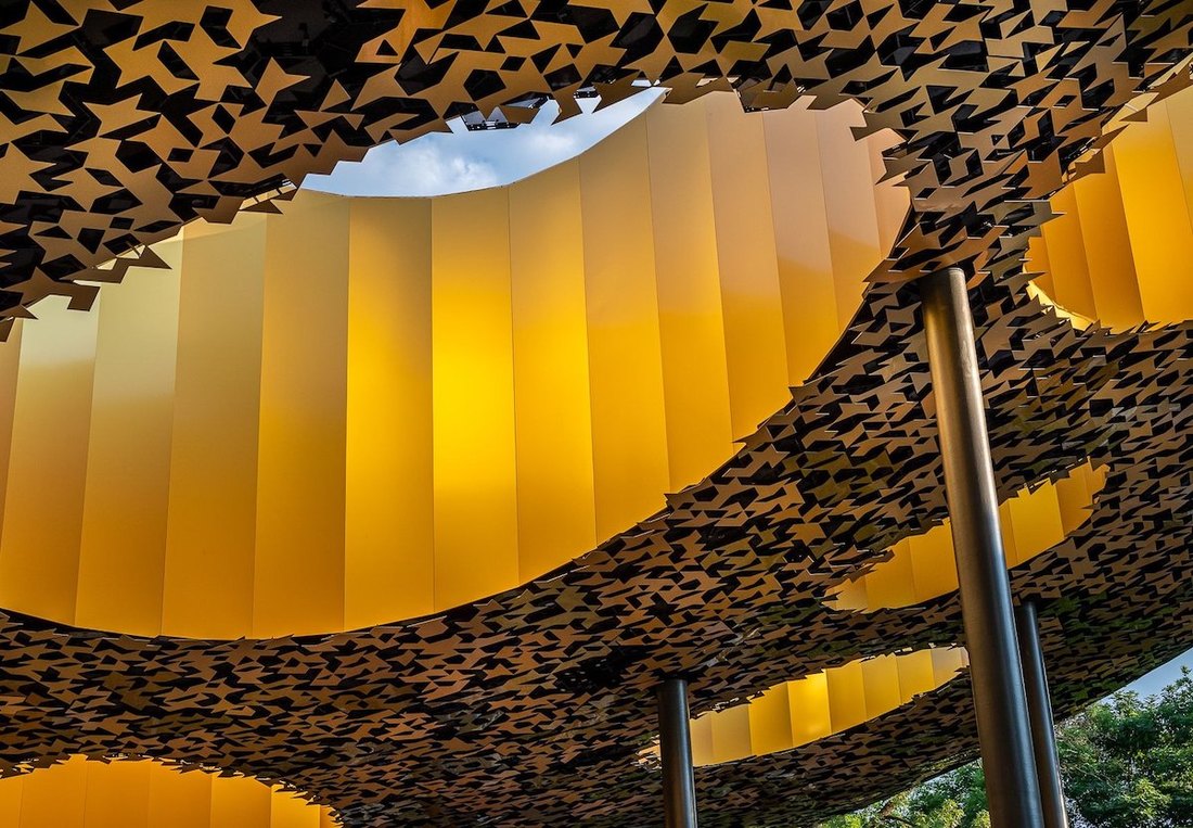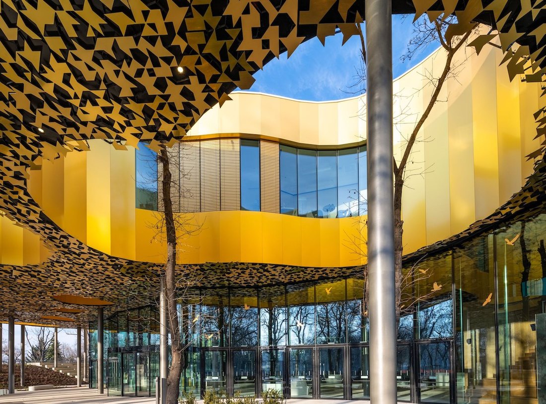 В городском парке в центре Будапешта открылось здание необычной архитектуры. Признаться, вид крыши сверху немного напоминает кусок сыра, а ее нижняя поверхность покрыта более 30 000 желтых «листьев». Там разместился Дом музыки, и теперь он очень интегрирован в природу. О примечательной постройке сообщает сайт archi.ru.
