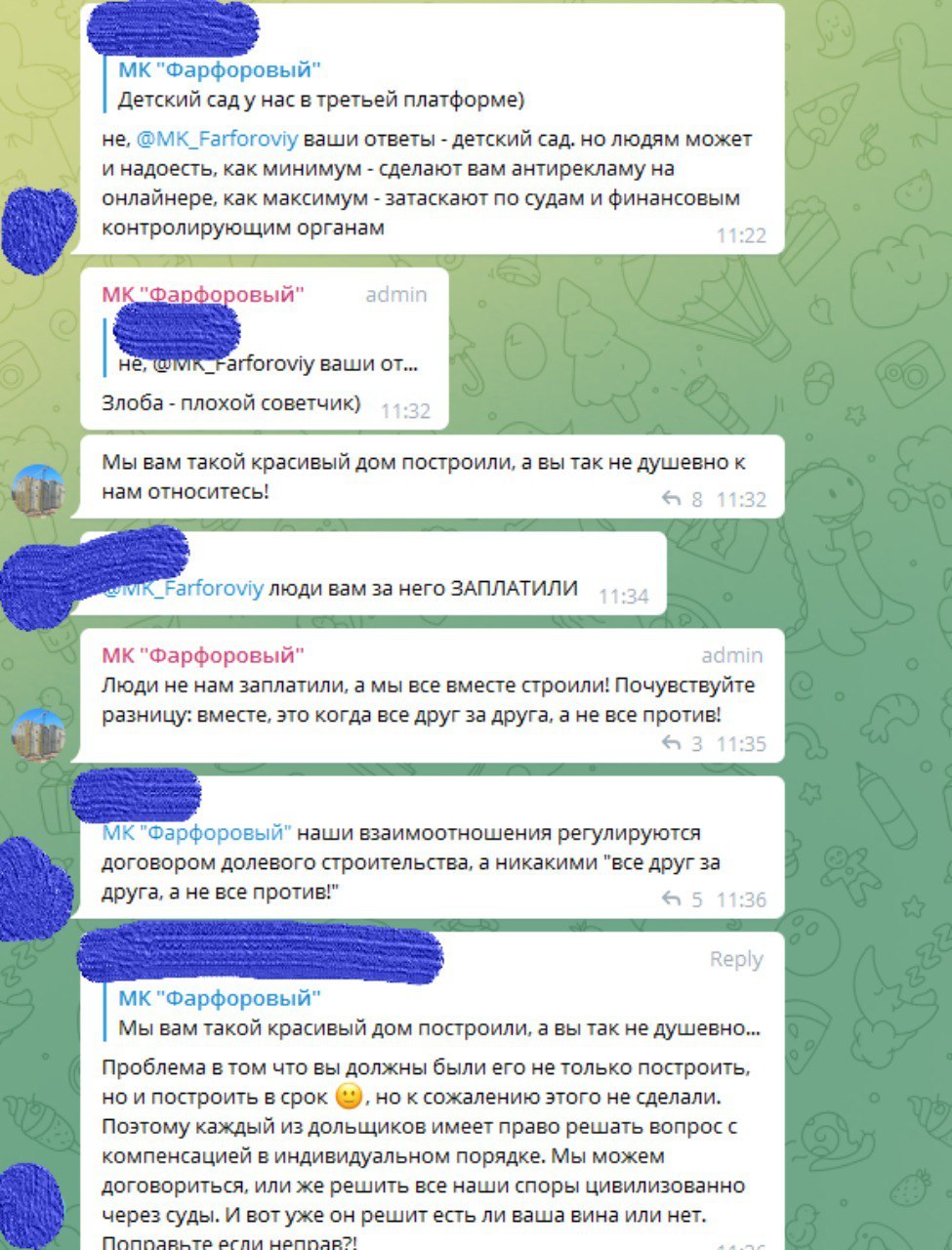 Фрагменты переписки дольщиков МК «Фарфоровый» с застройщиком прислали удивленные люди. Со слов будущих новоселов, «Инфореалт» не только затягивает сроки сдачи дома, но и откровенно хамит: «На все „неудобные“ вопросы мы слышим обвинения в яде, ненависти и агрессии». Узнали у застройщика, что происходит на стройке и в коммуникации с клиентами.