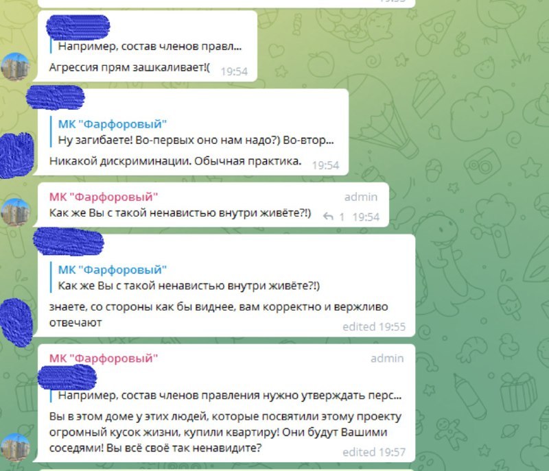 — К сожалению, наш дом до сих пор не введен в эксплуатацию, — рассказали Onlíner дольщики новостройки. — Мы не знаем, когда это событие произойдет, потому что застройщик не предоставляет никакой информации. Говорят только, что сами не знают и им постоянно кто-то в этом мешает. До этого обещали сдать 3 января, сейчас вообще не называют дат. Конечно, у дольщиков много вопросов, но представители застройщика в телеграм-чате считают приемлемым некультурное общение. На любые «неудобные» вопросы мы слышим обвинения в яде, ненависти и агрессии, идет откровенное проявление хамства. За предложения по улучшению работы и адекватную критику нас обвиняют в невежестве и некомпетентности.
