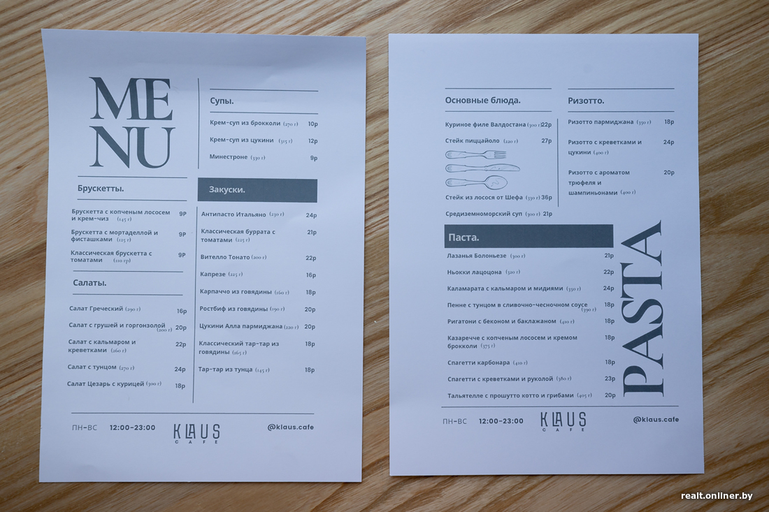 В Минске, на улице Раковской, открылось Klaus Cafe — уже второе заведение от итальянского шеф-повара Клаудио Роса, решившего покорить белорусов аутентичной пастой и пиццей. Первый ресторан Da Claudio появился полтора года назад и позиционировал себя как «место для особых случаев». А вот кафе решили сделать с более простой и понятной кухней. Рассказываем, что из этого вышло.