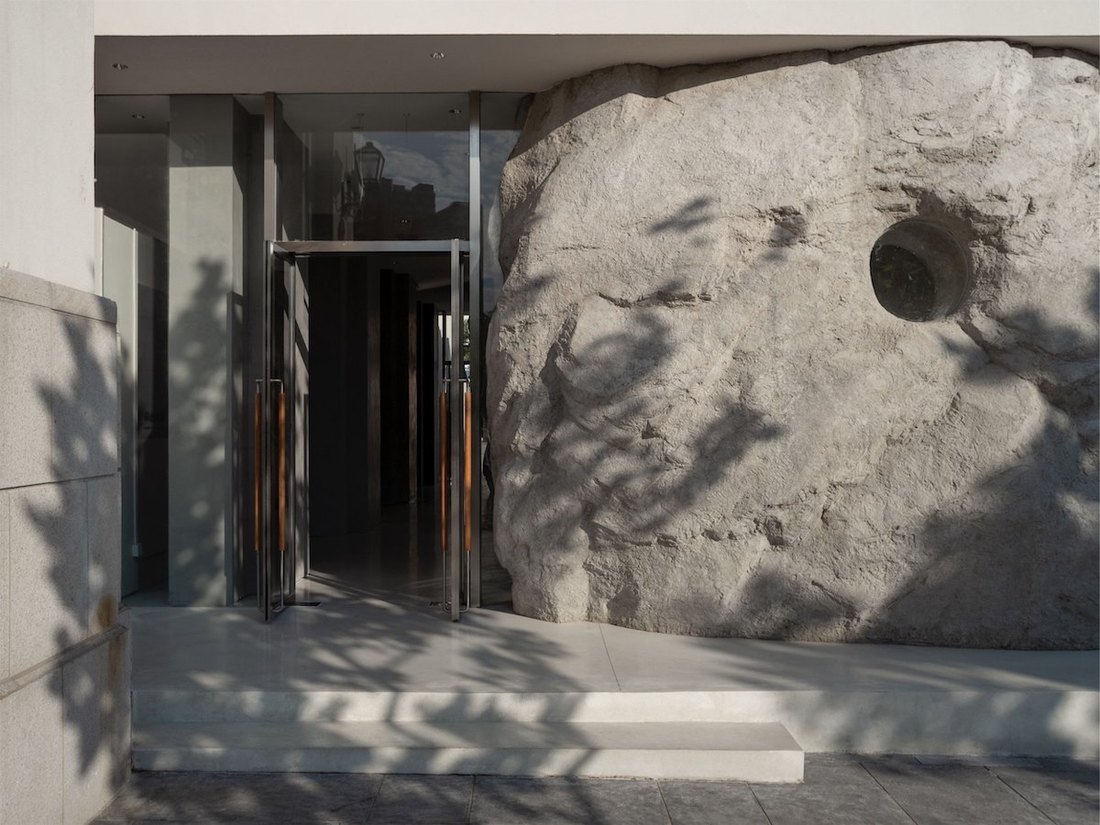 Фасады выполнены из стекла, их почти не видно. Зато бросаются в глаза огромные валуны. Кажется, что это настоящие камни, но нет. «Скалы» сделаны из стеклобетона.