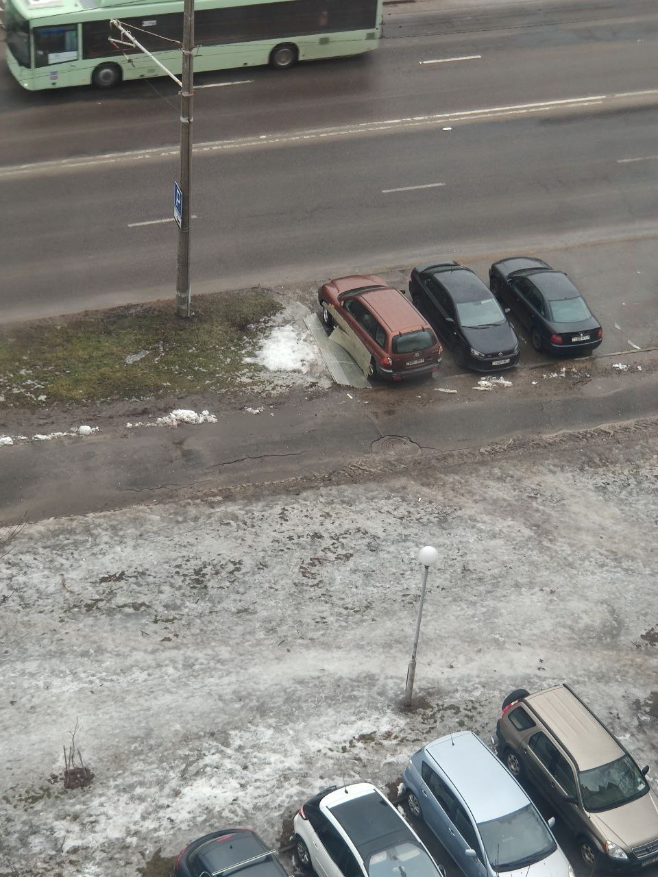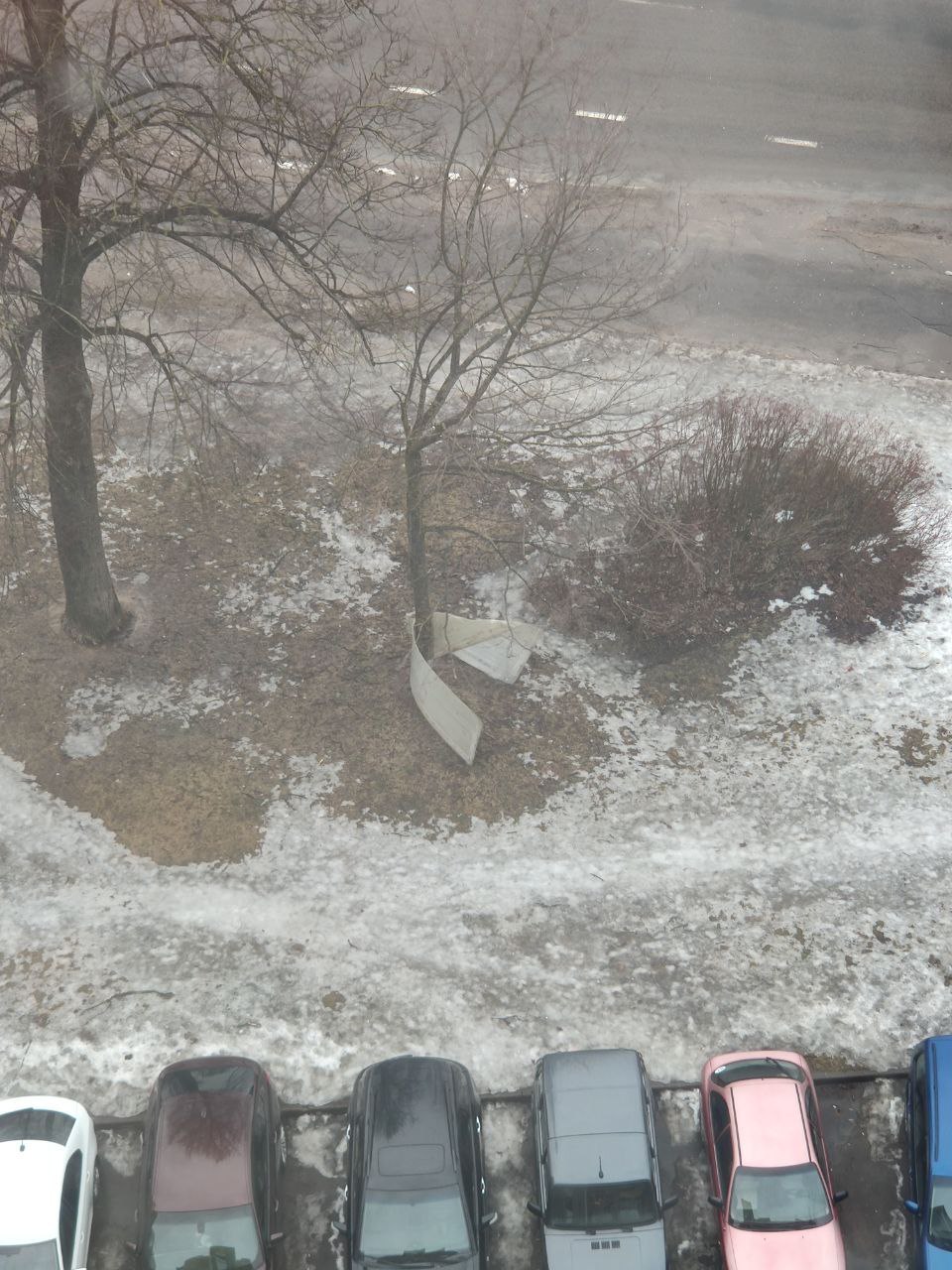 А это улица Могилевская, где возле магазина «Дионис» сорвало крышу с остановки. Теперь куски крыши летают по дворам, периодически прибиваясь к припаркованным автомобилям.