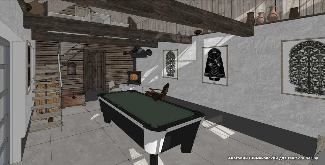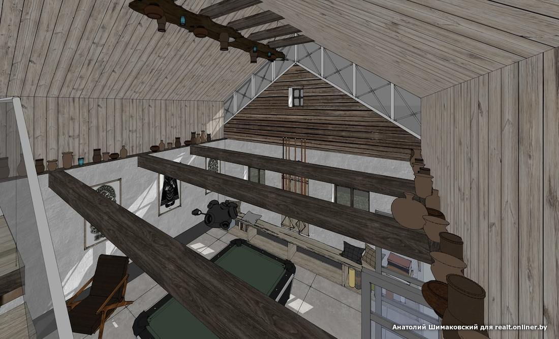 Вторую часть бывшего потолка разобрали, сделав второй свет. Остались только старые балки, сквозь которые можно видеть комнату снизу. Там, по задумке архитектора, должна разместиться условная бильярдная.