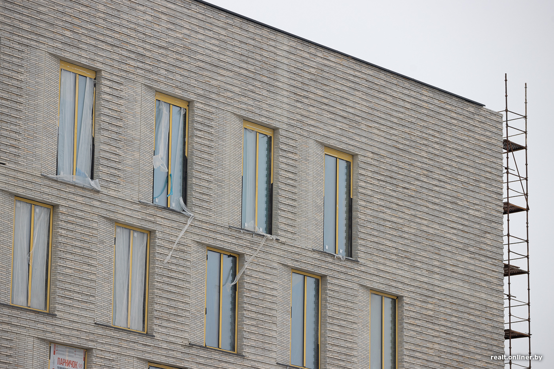 На днях исчезла строительная «вуаль» с первой (из трех) шестиэтажек-кубиков. Отсутствие острых углов, мелкий кирпичик, рамы в защитной ярко-желтой пленке (под ними профиль цвета графит) — первое, что бросается в глаза. Сами стекла не зеркальные, без экзотических оттенков. Некоторые еще укутаны в защиту, другие уже освобождены.