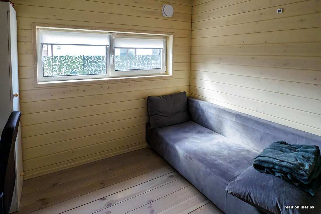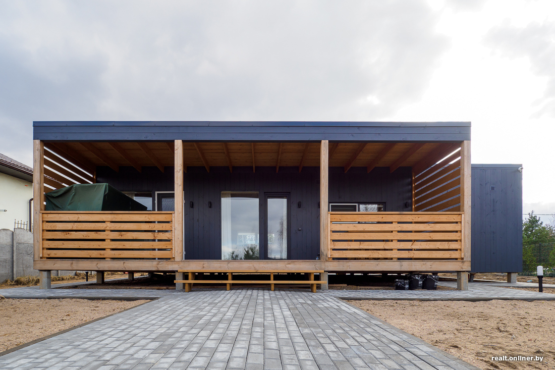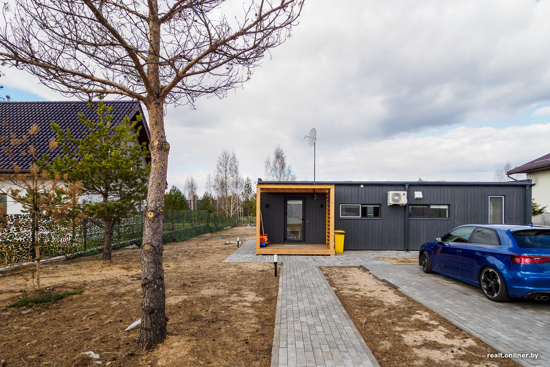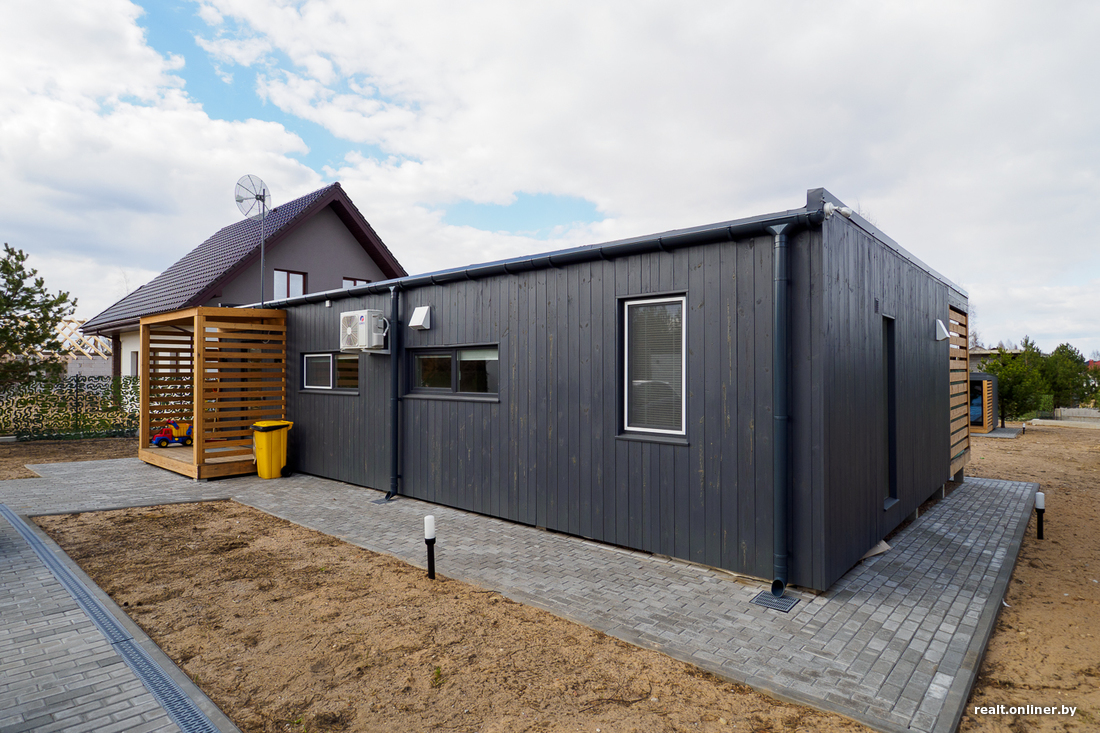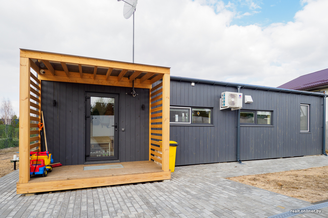 Три небольшие жилые комнаты (одна почти 7 «квадратов», две другие — по 8), просторная кухня-гостиная, санузел и 20-метровая терраса — то, из чего состоит готовый 98-метровый модуль. Высота потолков в доме непривычная — 2,4 метра. На участке площадью 15 соток есть и второй модуль от того же производителя, в нем находится баня.