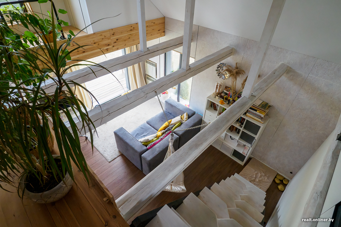И теперь первая реакция всех гостей, попавших к нам впервые, — вау, какой у вас огромный дом! Все потому, что высота потолка — 7 метров. За счет этого и создается такое впечатление. На самом же деле наш дом имеет площадь 95,5 «квадрата».