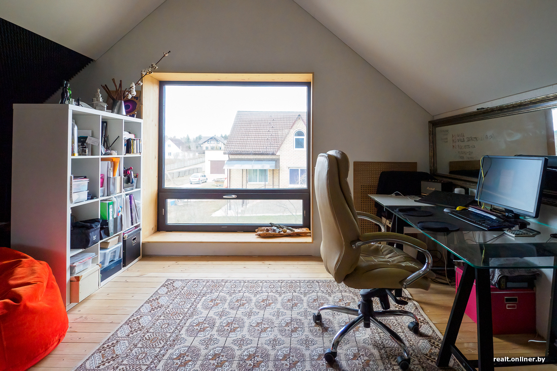 — Отдельная наша находка — кабинет с панорамным окном. Будучи на втором этаже, я прекрасно вижу, чем заняты дети, находясь в гостиной. Все под контролем. Также мы максимально работали со светом (как с естественным, так и с искусственным), поэтому в любое время суток и в любую погоду у нас уютно.