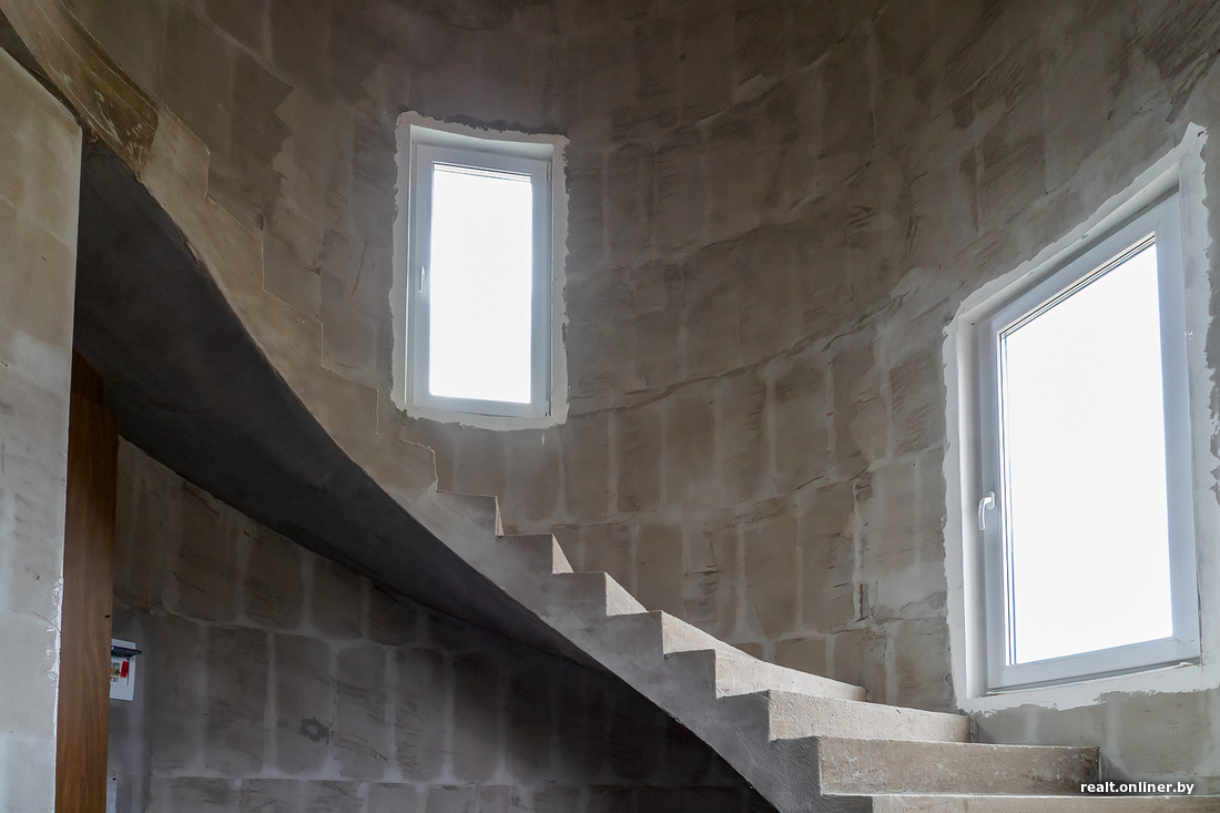 Первый этаж необычного коттеджа готов к проживанию. Второй еще требует доделки: какие-то помещения уже зашпаклеваны, какие-то только оштукатурены. Доработка нужна и фасаду. По замыслу собственника, все наружные поверхности будут облицованы АМК-панелями под кирпич. Выдержан фасад будет в светлых тонах.