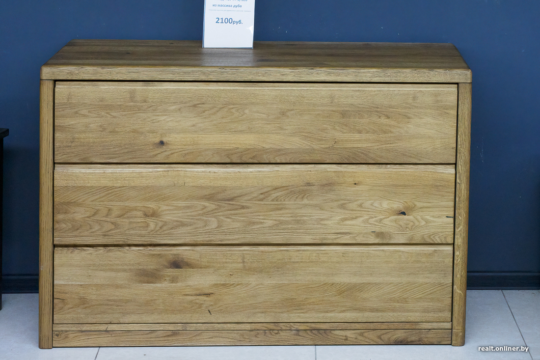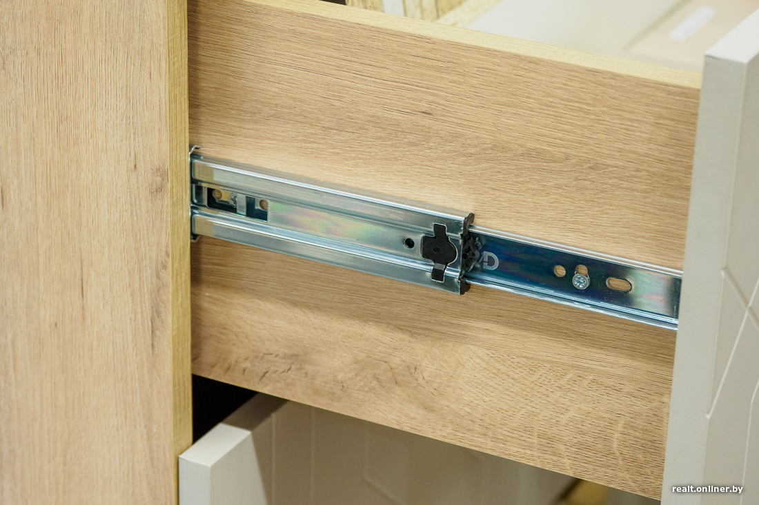 — Интересный экземпляр, неплохая фрезеровка. Может вписаться даже в неоклассический интерьер. При выборе подобной мебели обязательно смотрите на то, чтобы ящики не провисали, а также на наличие доводчиков, на фурнитуру. Конечно, лучший вариант — это фирма Blum, но ее продукция дорогая. Есть Hettich, он чуть дешевле. Ну а совсем бюджетные аналоги — Muller, GTV. Они вполне допустимы в комодах, ведь люди редко ими пользуются. Все-таки это не кухонный гарнитур — на нем как раз таки экономить не стоит.