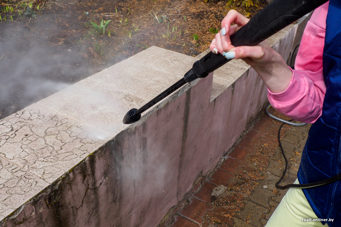 — Моющие средства используются только в случае сильных загрязнений — например, остатками краски или известью. Сначала щеткой и средством отмываем пятно, потом уже обрабатываем это место мойкой высокого давления.