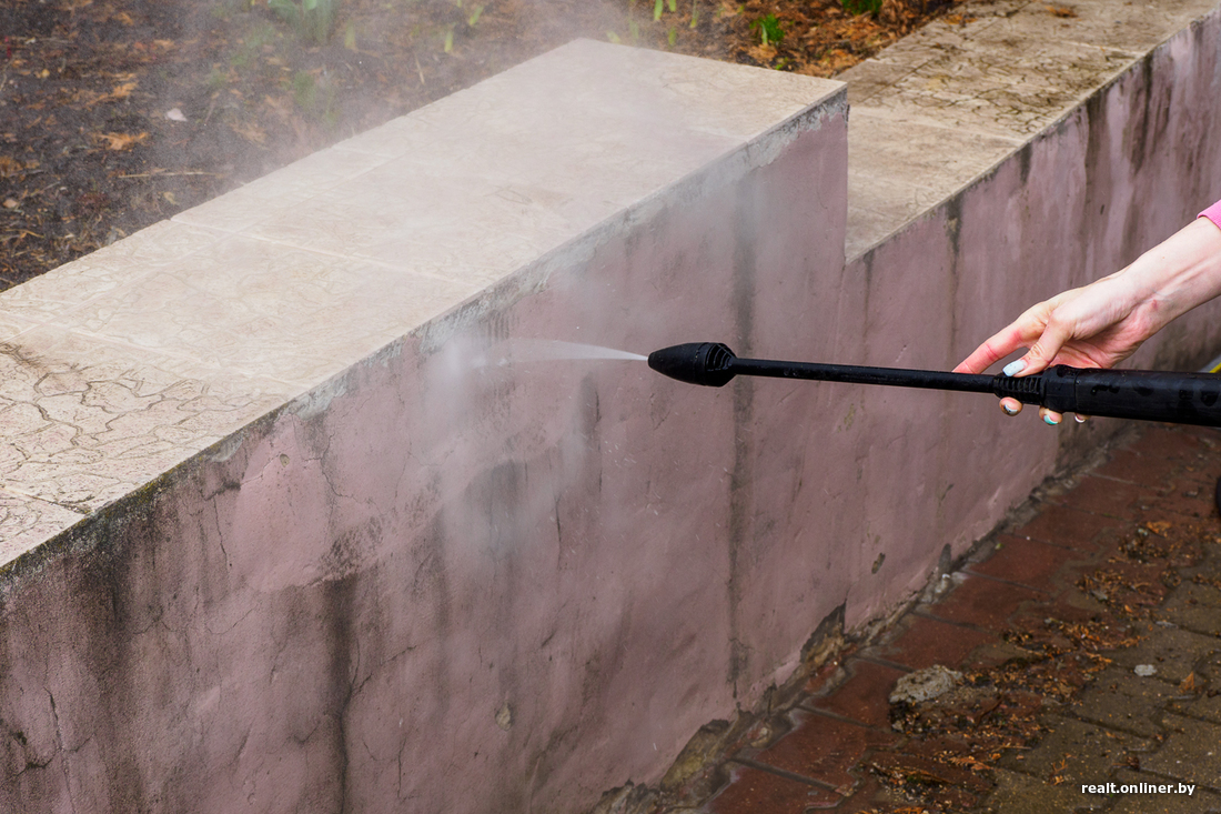 Сильная струя воды запросто отмывает и подпорную стену во дворе, абсолютно по тому же принципу работаем с заборами.