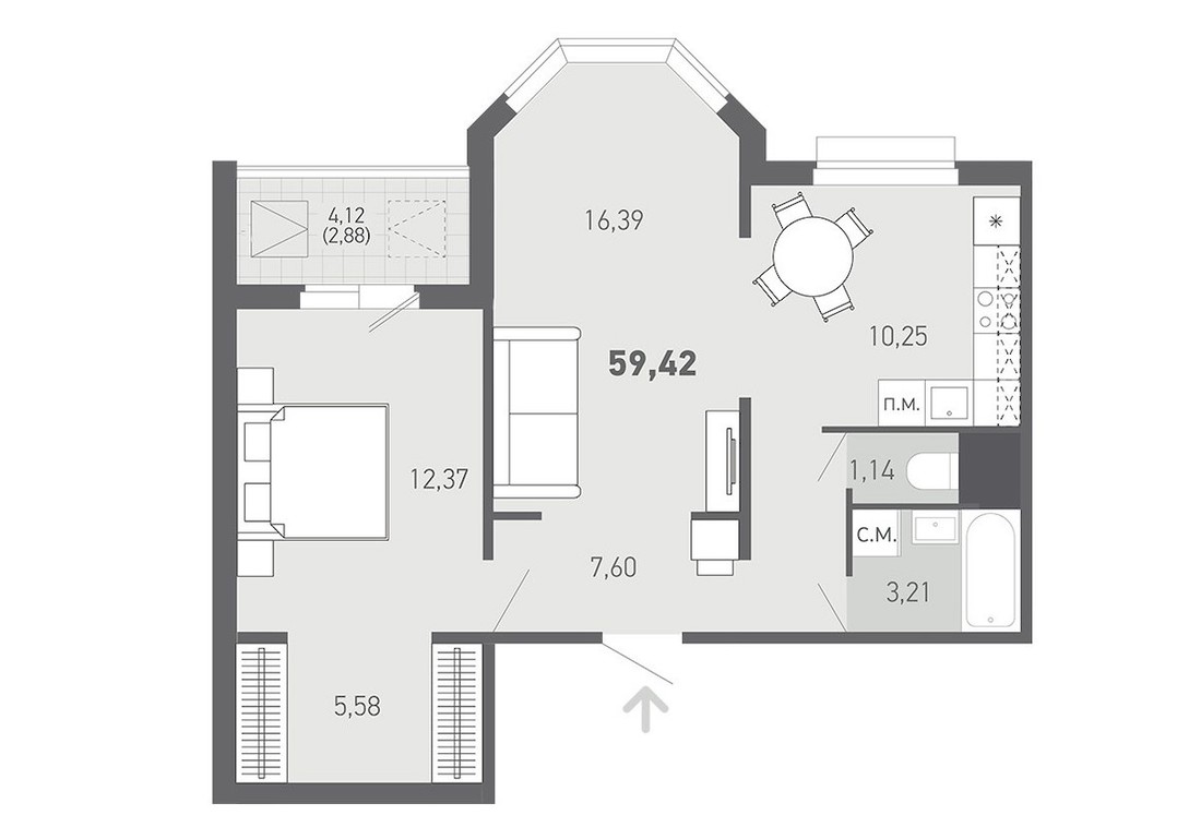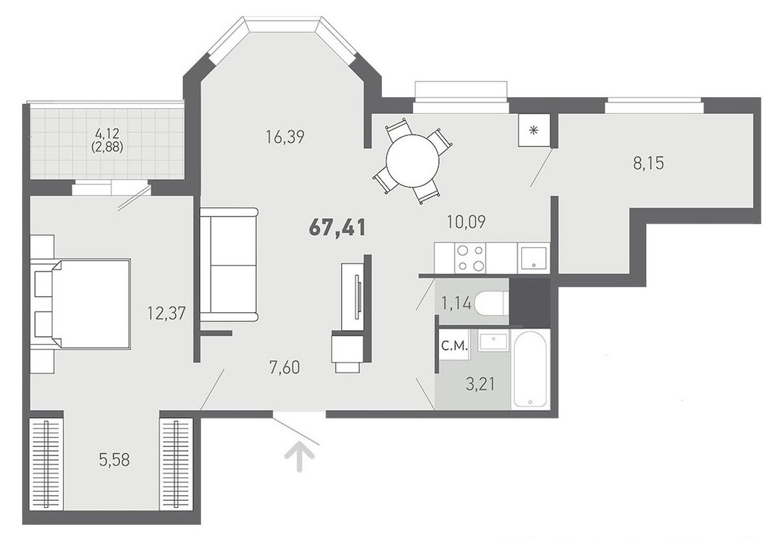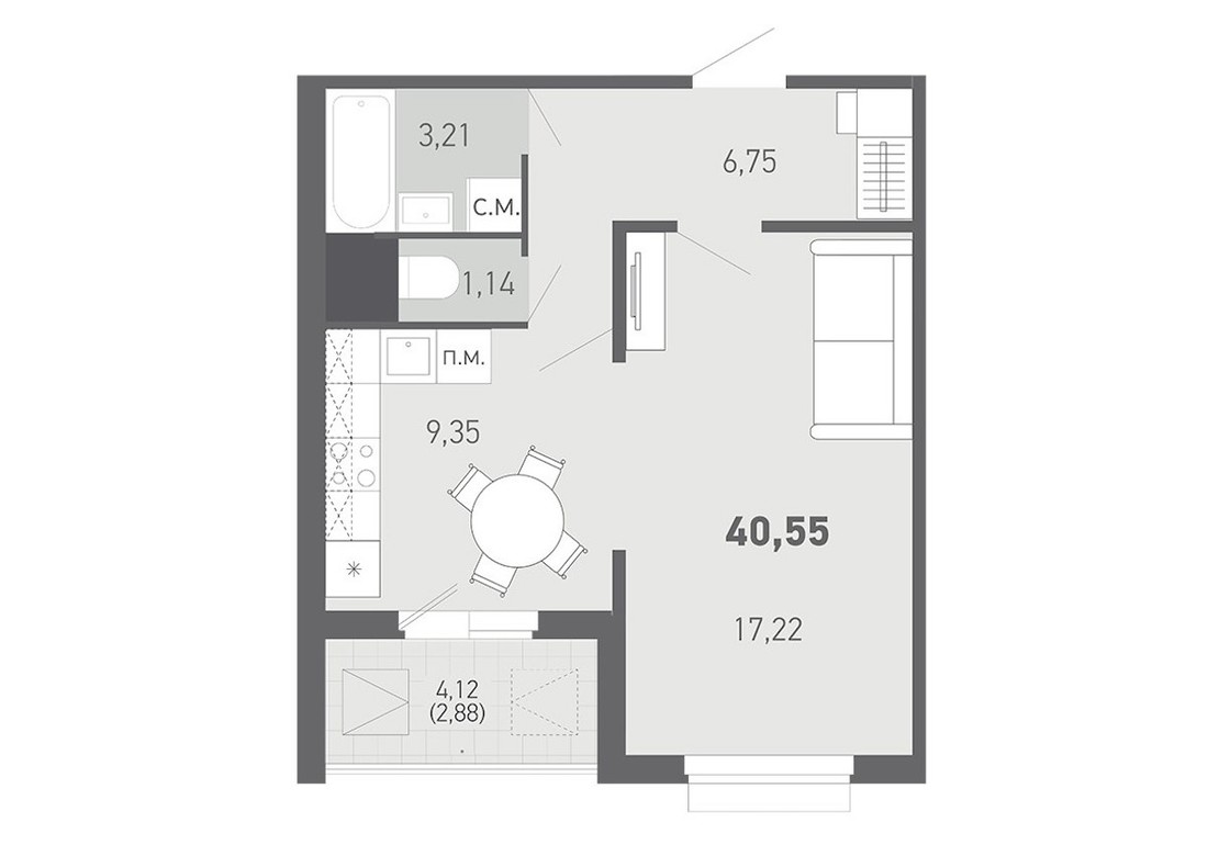 В доме предусмотрены только однушки и двушки. Но довольно просторные: «однушки» от 40,55 «квадрата». Самая большая двушка — на 67,41 кв. м. Кухни будут объединены с гостиными, предусмотрены хобби-комнаты.