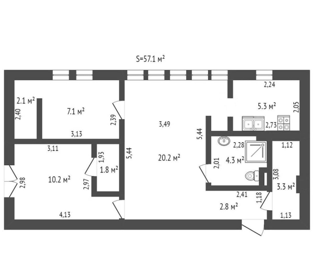 Это трешка с дизайнерским ремонтом, общая площадь — 57,1 «квадрата», жилая — 41,4, кухня — 10 метров.