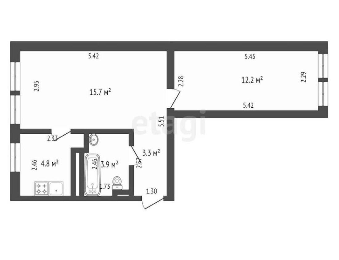 Общая площадь — 55,9 «квадрата», жилая — 39,9, кухня — 4,9 метра. Трехметровые потолки также позволяют обустроить второй этаж.