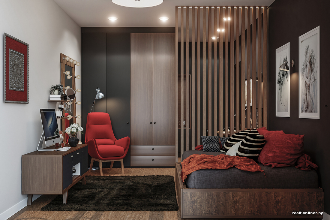 Обеденная зона отделена от гостиной с помощью реечной перегородки. За ней скрывается кровать-трансформер: днем это диван, на котором могут разместиться гости, а вечером — спальное место. Напротив располагается рабочее место.