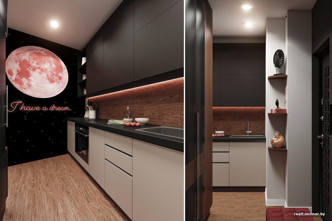 Для зонирования минчанка установила в прихожей шкаф, чтобы создать зигзагообразный коридор. Одной стороной он выходит на кухню — внутрь встроен холодильник.