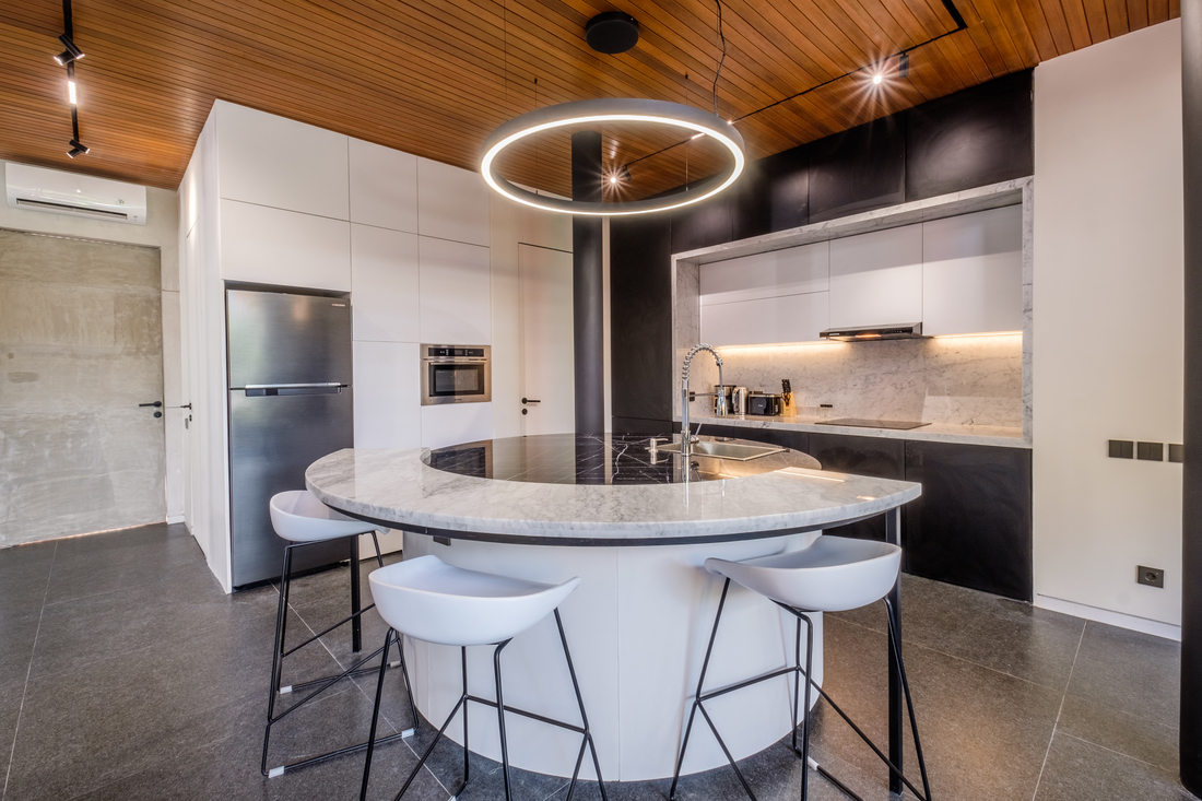 — Современная архитектура, у каждой виллы свой бассейн. В гостиной панорамные окна, из которых открывается вид на сад. В отделке использовали много местных материалов — дерево, камень и т. д. Мебель делали на заказ, сантехнику и электрику везли из Китая.