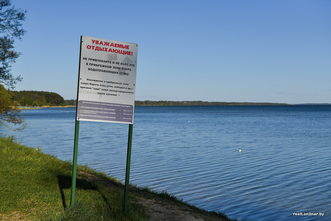 Но если есть что-то вечное на Нарочи, помимо самой Нарочи, так это вероятность подхватить аллергодерматит. Cудя по грозным надписям на многочисленных табличках, опасность не миновала: это вполне реально, если купаться за пределами цивилизованного пляжа.