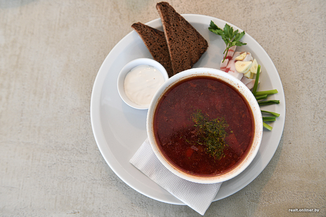 Почем здесь можно перекусить? Баварскую пиццу на 550 граммов испекут за 23 рубля, драники с беконом и грибами — 13 рублей, борщ белорусский — 12.