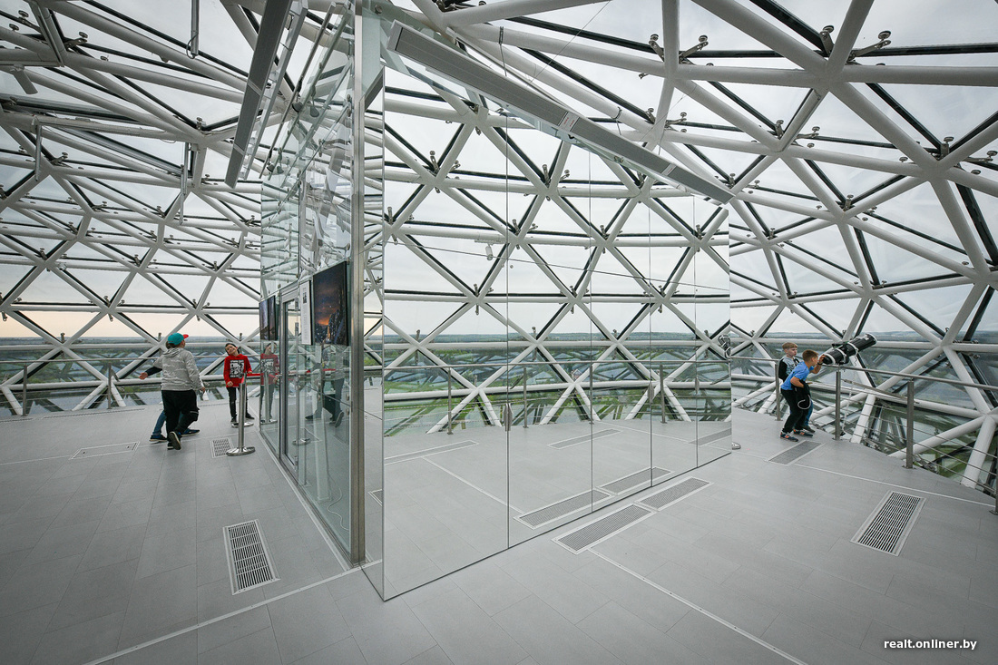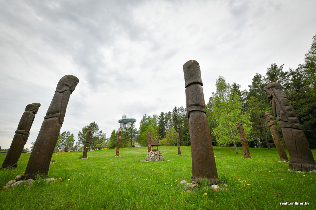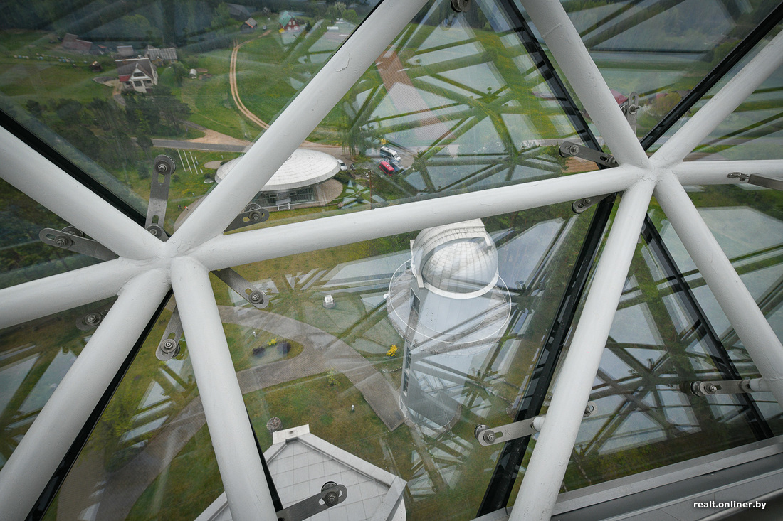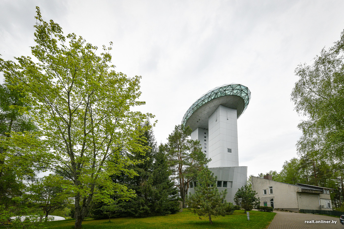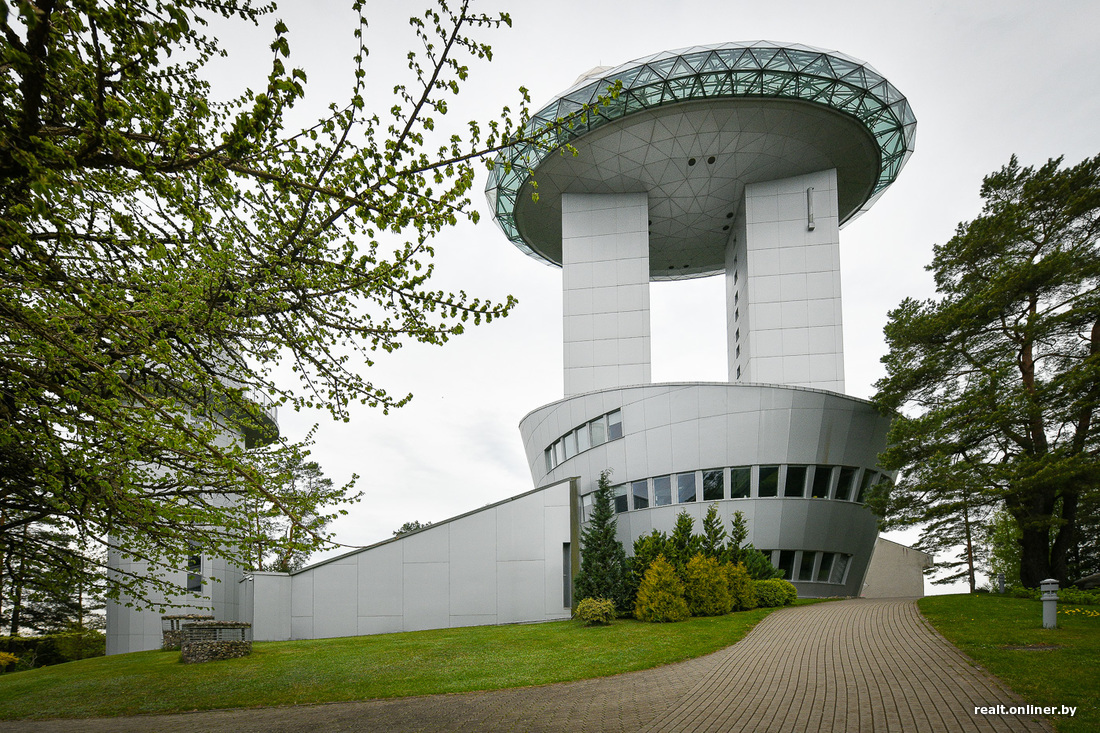 Современное здание Музея этнокосмологии на базе старого долгостроя еще позднесоветских времен было построено в 2007 году по проекту литовских архитекторов Ричардаса Криштапавичюса и Андрюса Гудайтиса. Гостей встречает входной павильон, выполненный в виде своеобразной линзы, которая напоминает летающую тарелку, приземлившуюся на землю. В нем находится вестибюль с кассами, гардероб и туалет, а на втором этаже расположены кафе и музейный магазин. Основной корпус стилизован под некое мифологическое «Космическое древо», связывающее землю и небо. Это его силуэт так хорошо заметен при подъезде к комплексу. Наверху, на 32-метровой высоте, размещена обзорная площадка, с которой открываются прекрасные виды на литовский озерный край. Ну а странная надстройка над стеклянным диском — это телескоп. Музей все же — дитя обсерватории, хотя в данном случае астрономический инструмент работает для развлечения публики, превращая это мультифункциональное место еще и в планетарий.