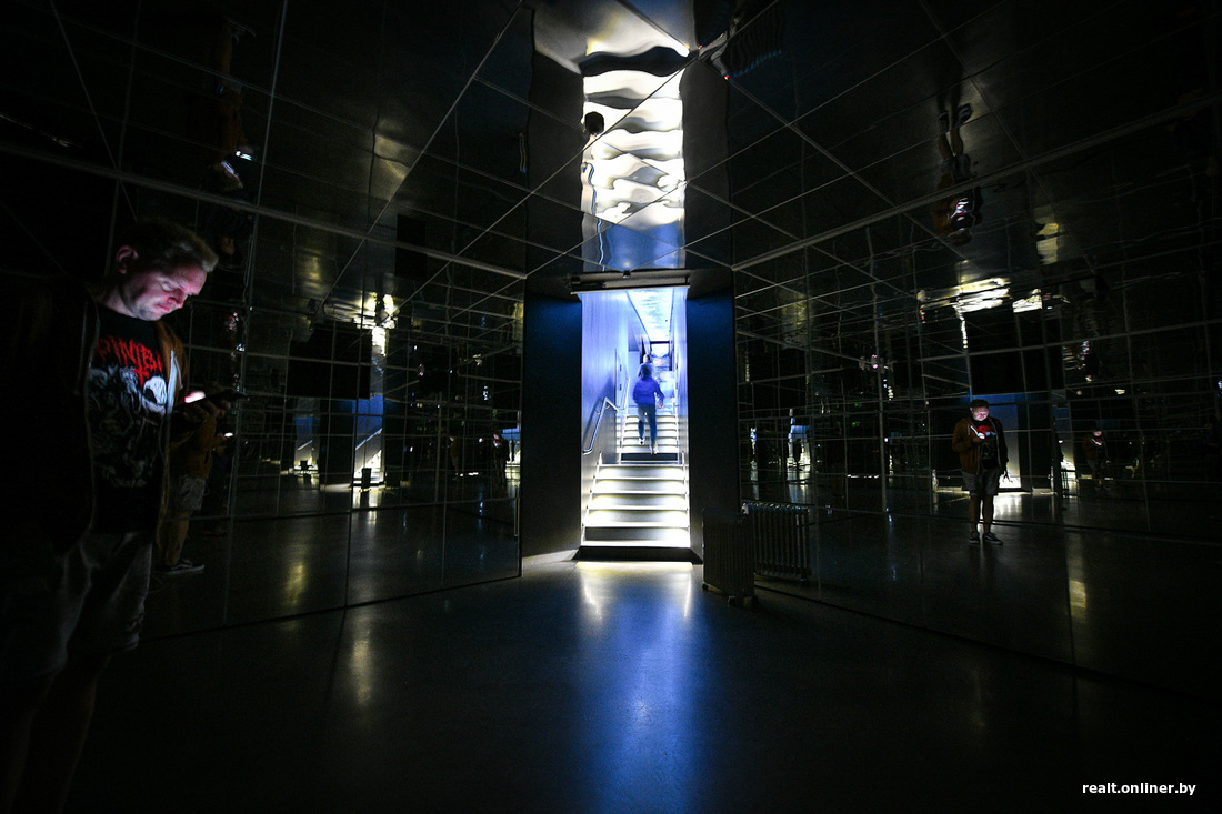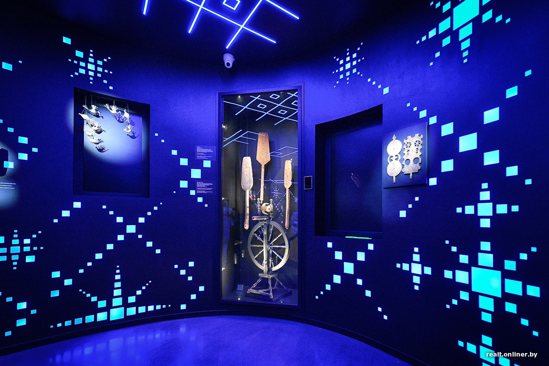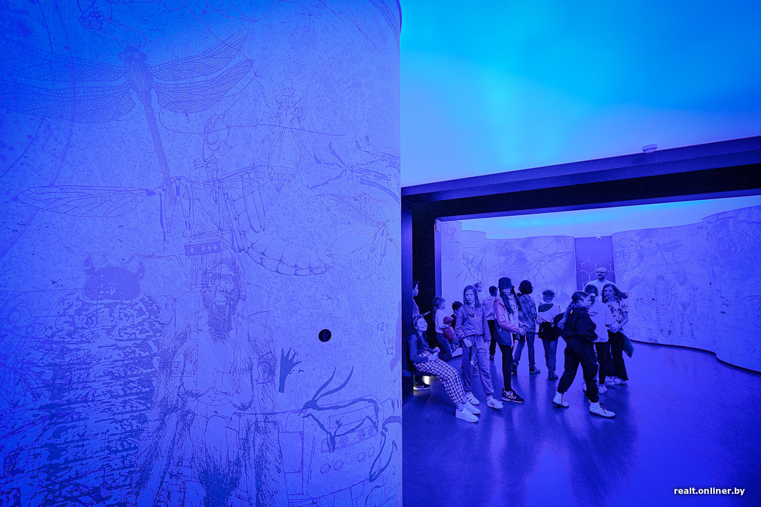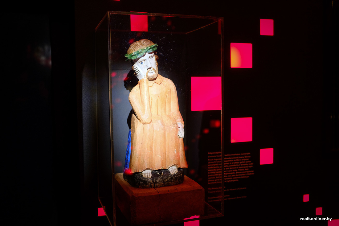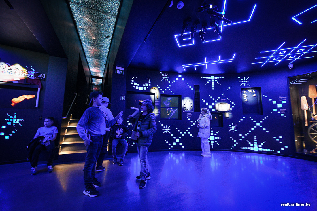 Ну а собственно экспозиция спрятана в подземной галерее. То есть покупая билет (6 евро за вход), вы попадаете в символическое путешествие по корням «Космического древа» к его вершине. Через семь залов, расположенных лестницей, гость поднимается вверх под склоном холма, параллельно проникаясь разными аспектами той самой этнокосмологии: от национального восприятия литовцами мира космоса (через легенды, сказки, обряды, мифологию) и познание того, что лежит за пределами земной атмосферы, научными методами к футурологическим вызовам, стоящим перед человечеством. В конце показывают кино.