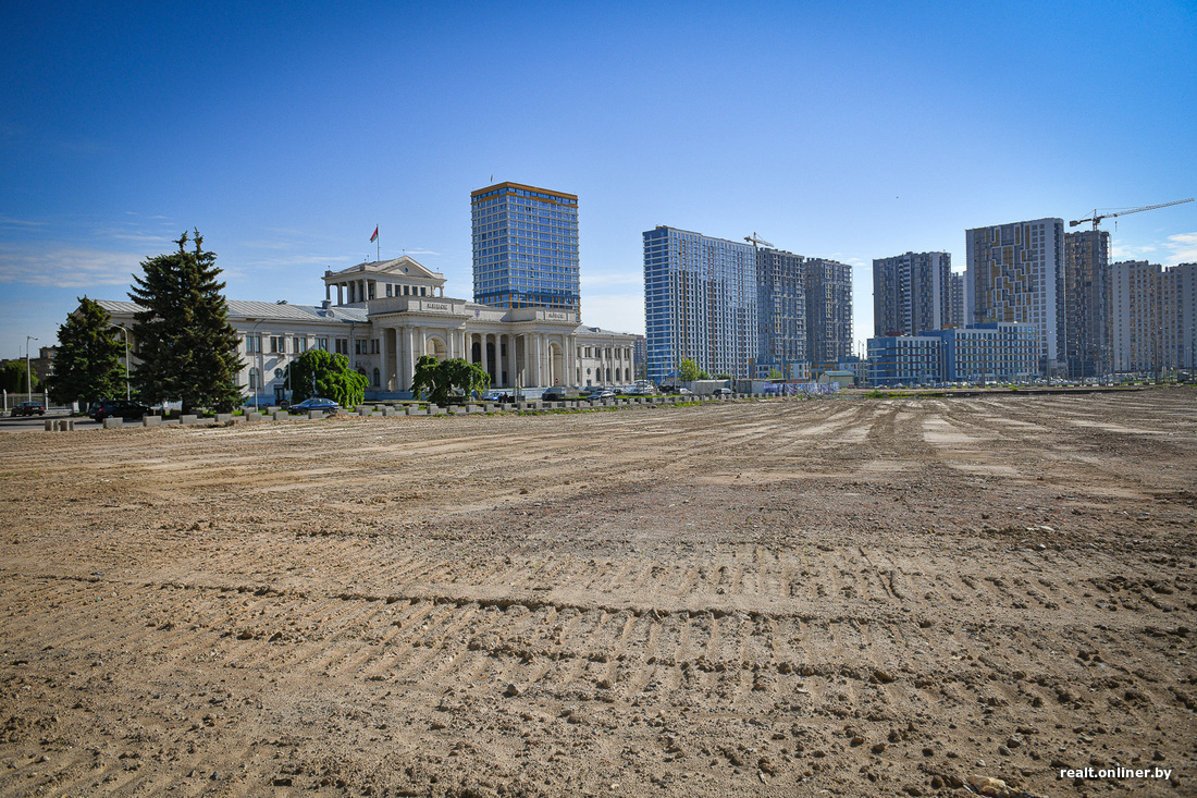 Зайдем сбоку — туда, где в прошлый раз нас встречали комья грязи под ногами и высотки на горизонте. Ближайший к историческому зданию кусочек еще не застроили (его берегут для грандиозного по масштабам многофункционального центра), а вот по жилой части видны подвижки. Достроились и обрели окрас дома в левой части, а справа, над аэропортом, появилась голова очередной свечки.