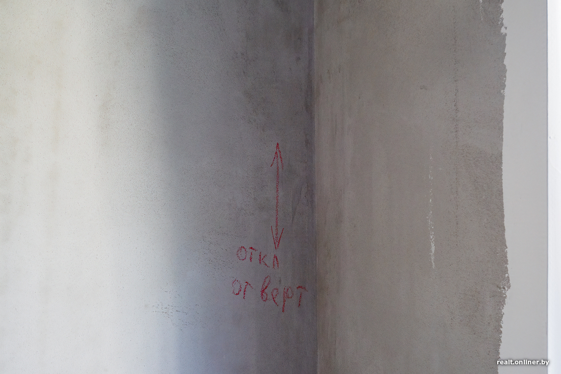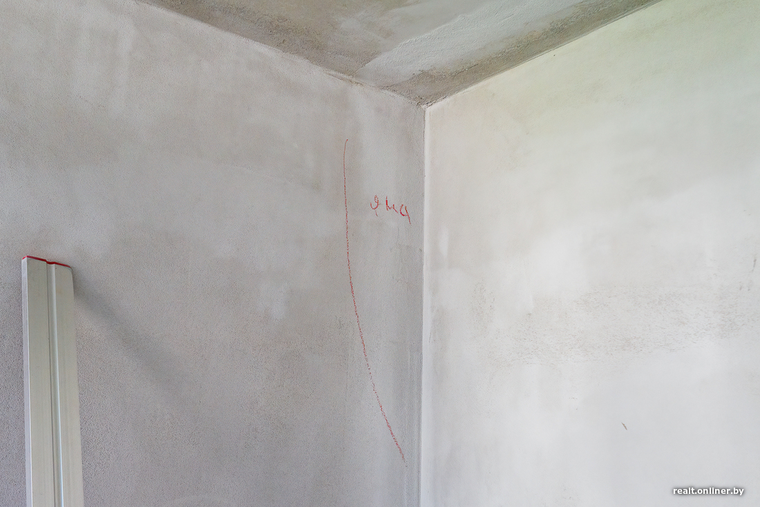 А вот участок возле окна в левой спальне придется перештукатуривать полноценно: эта часть развернута пропеллером. Над окном тоже момент отклонения от нормы. Обычно «Айрон» очень хорошо делает штукатурку (даже сейчас отслоений совсем нет), но вот тут есть огрехи, которые надо исправлять. Например, вместо «прогиба» до трех миллиметров (что было бы в допуске) имеем четыре с половиной. Или вот в другой спальне: стена идет идеально ровно, а «хвост» почему-то не дотянули, — показывает специалист.