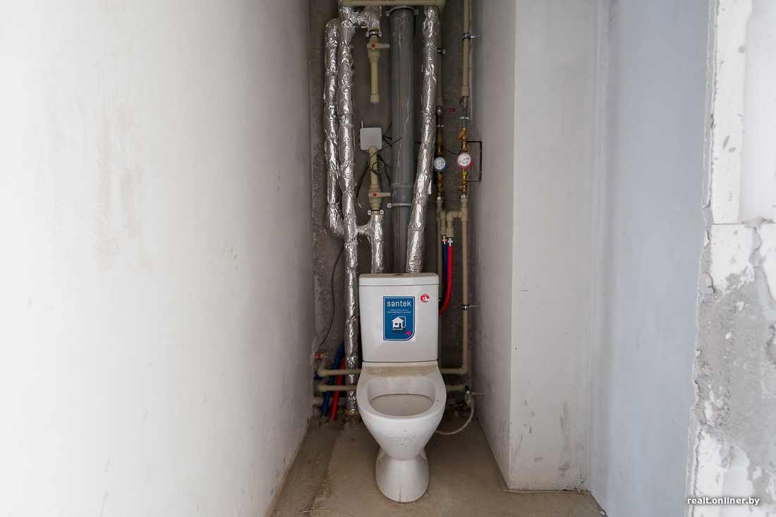В ванной видим, что левая стена немного завалена, к тому же по центру есть «яма». В туалете все в допуске, но одна перегородка как бы «подвалена». Просто держите это в уме и учтите, когда приступите к отделке.