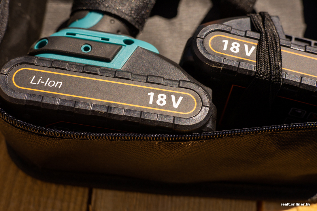 Еще одна относительно бюджетная модель на 18 вольт. Чуть дешевле предыдущей, но проще технически: двигатель со щетками, электронного управления скоростью нет. Зато в наборе два аккумулятора, а значит, запас по времени работы скорее всего будет больше. Зарядное простейшее, как у Favourite, — просто блок со штекером.