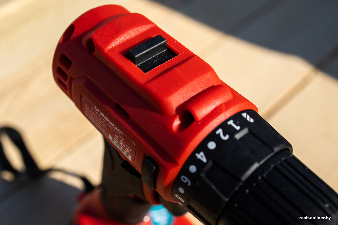 Помимо механической регулировки скорости сверху, есть еще и электронная регулировка частоты вращения внизу рукоятки — любопытное решение. Там же индикатор заряда аккумулятора. Подсветка рабочей зоны также есть, но в современных шуруповертах это скорее стандарт.