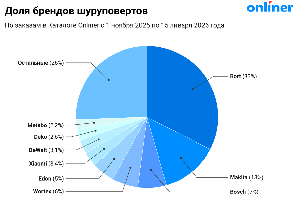 По статистике продаж в Каталоге с начала года первые три места по доле заказов среди брендов делят Bort, Makita и Bosch. На них приходится более половины суммарных продаж (53%). При этом рейтинг конкретных моделей, как обычно, немного отличается от общей картины по брендам.