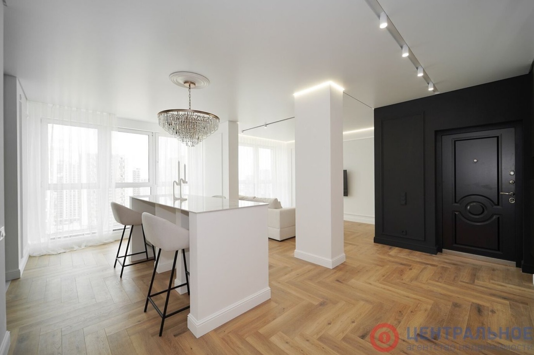 Стоимость самых дорогих квартир начинается от 300 000 у. е. К примеру, такая трешка на 14-м этаже ЖК «Браславский» обойдется в $320 000 по курсу. Дизайнерский ремонт завершен в прошлом мае. Вся мебель изготавливалась по индивидуальному заказу.