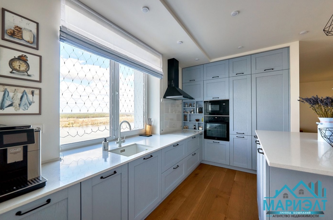 А если добавить еще $10 000 по курсу, можно купить жилье на 19-м этаже комплекса D3. Размер — 113,1 «квадрата». Изюминкой интерьера можно считать небесно-голубую кухню, выполненную по индивидуальному заказу. А еще — наличие сразу двух гардеробных и двух ванных комнат.