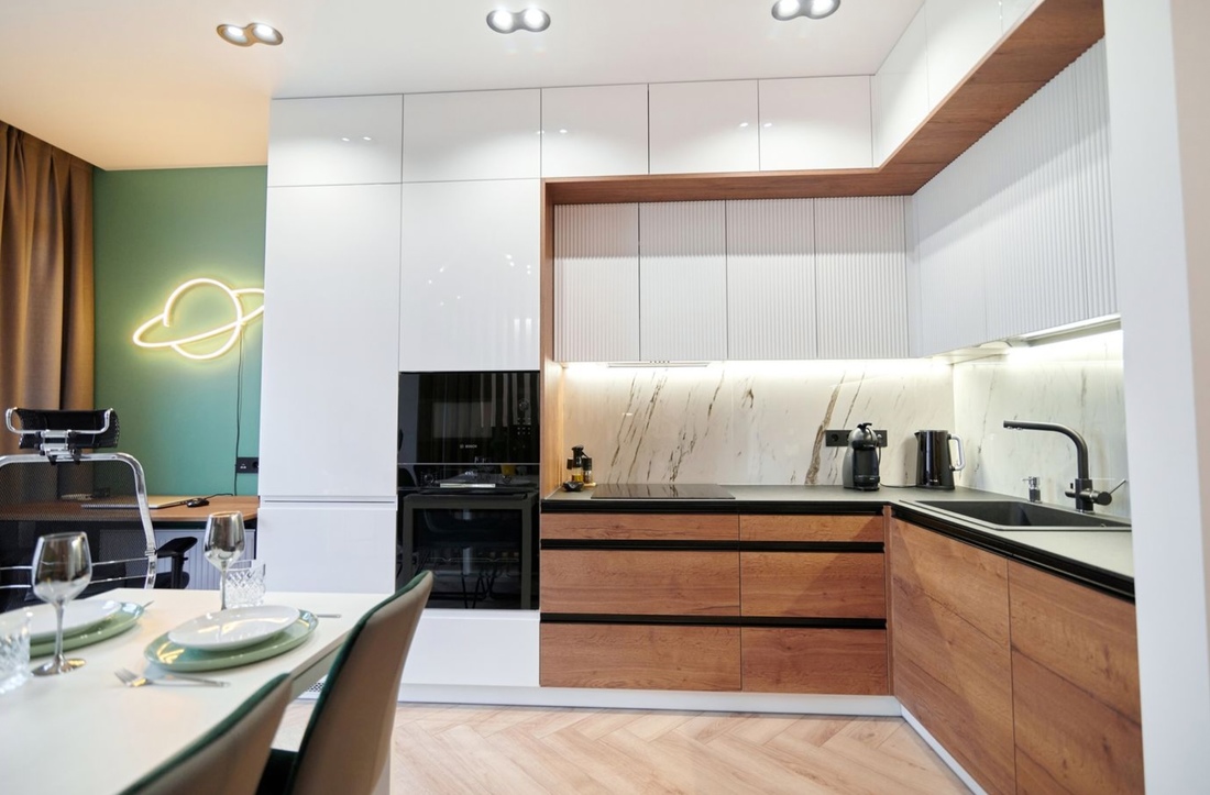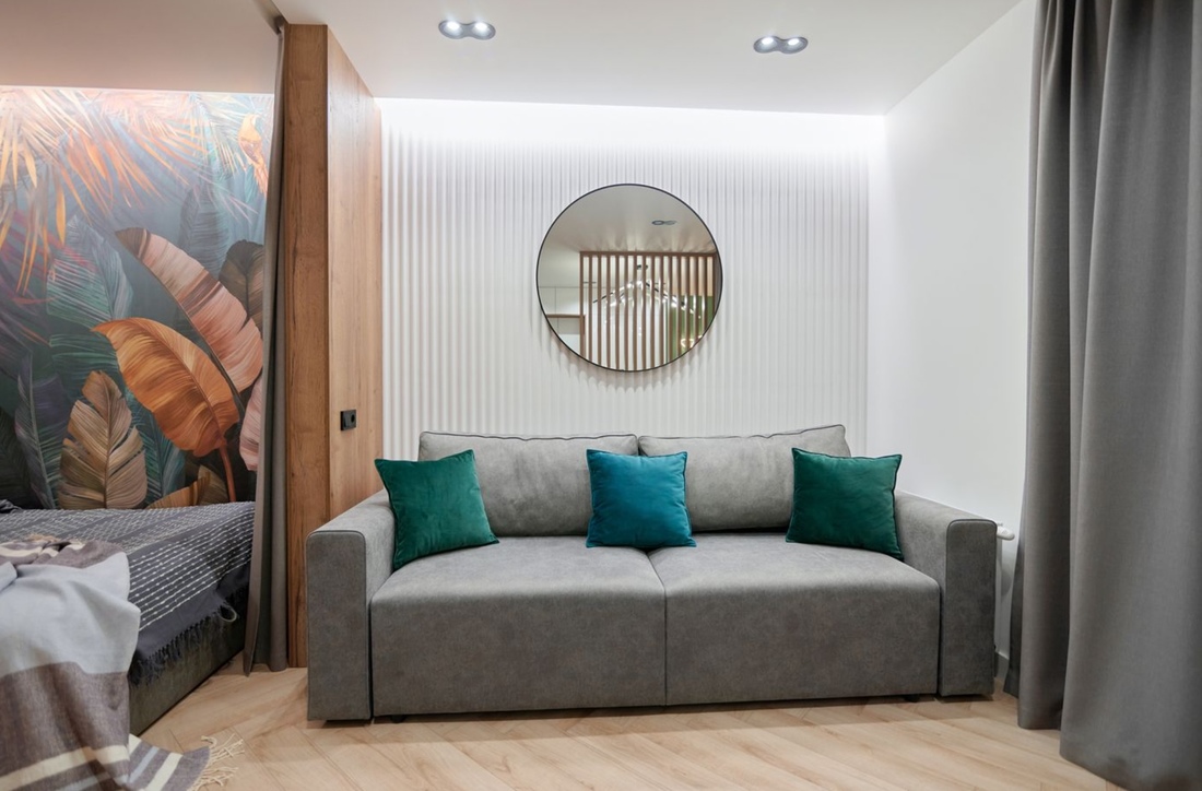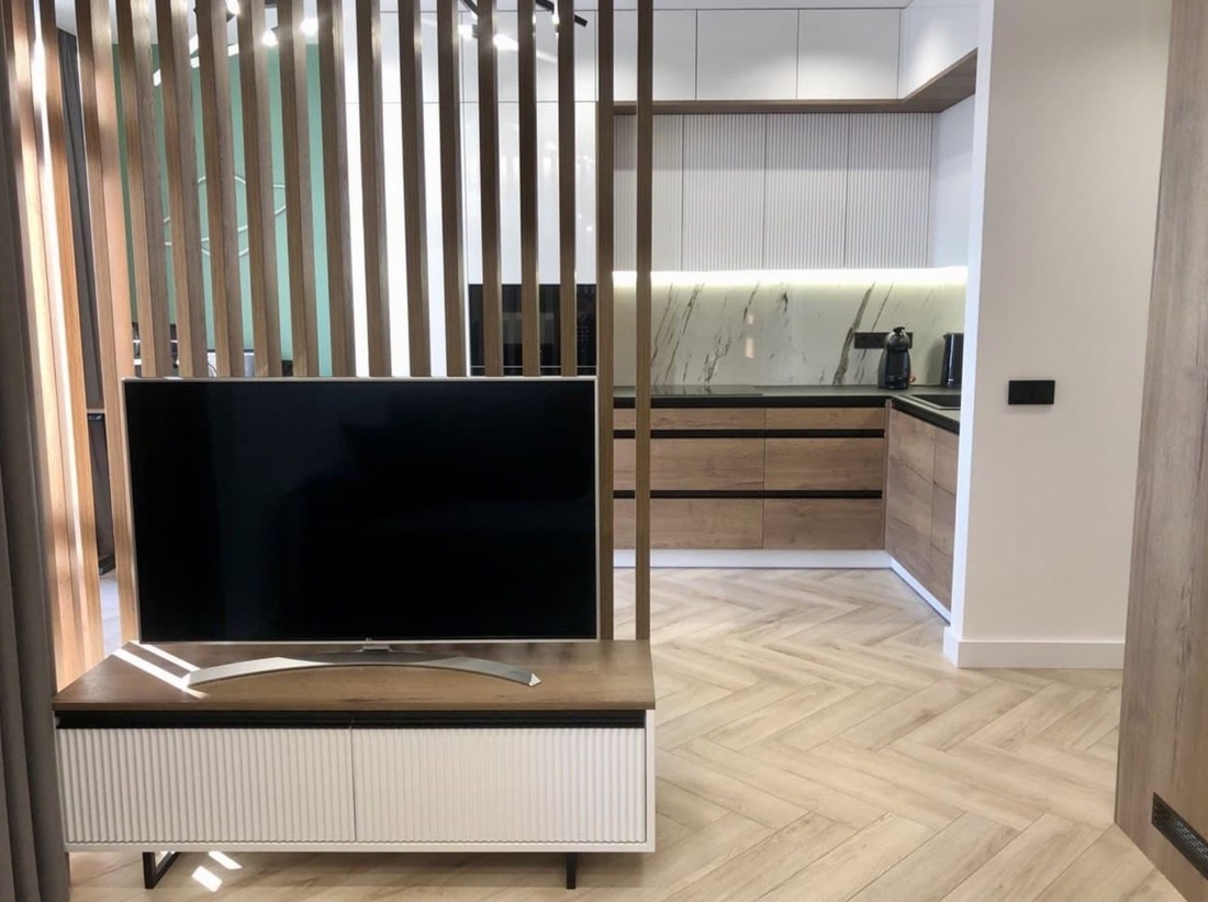 Если говорить о недвижимости подороже, то как вам такая однушка за $86 000 по курсу? Благодаря грамотной планировке, на площади в 38,2 «квадрата» удалось расположить много функциональных зон: кухню, рабочее место, гостиную, спальню и санузел. При создании интерьера использовались такие актуальные решения, как обилие дерева, реечные перегородки, контрастное сочетание черного и белого, различные световые сценарии.