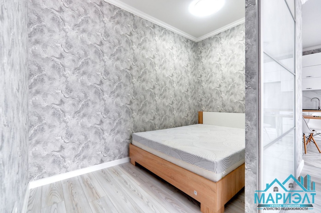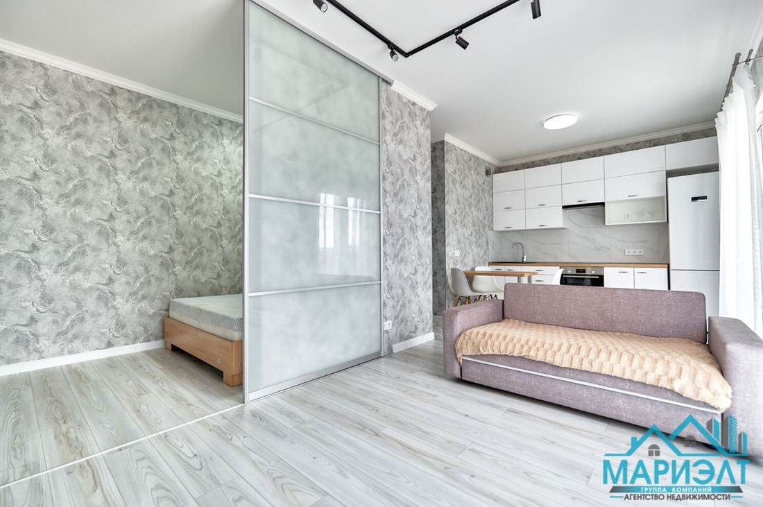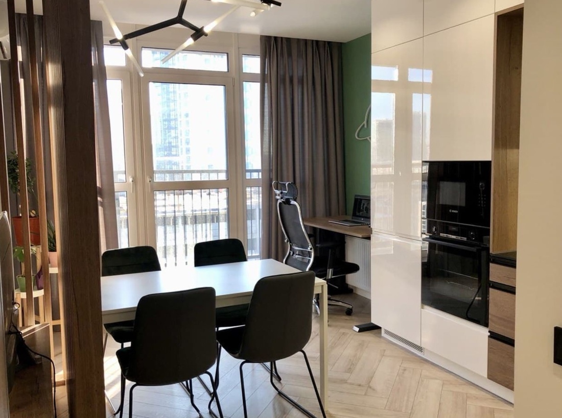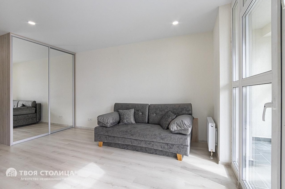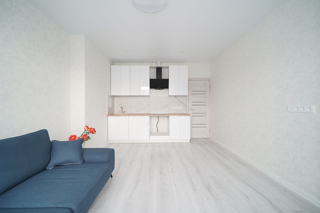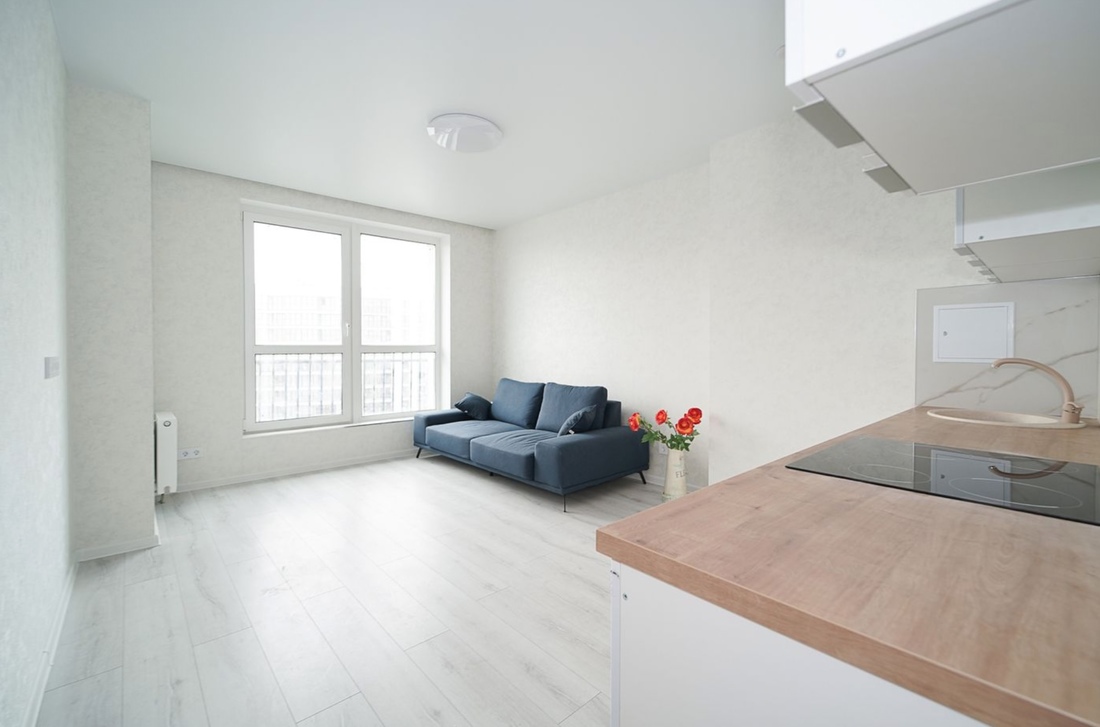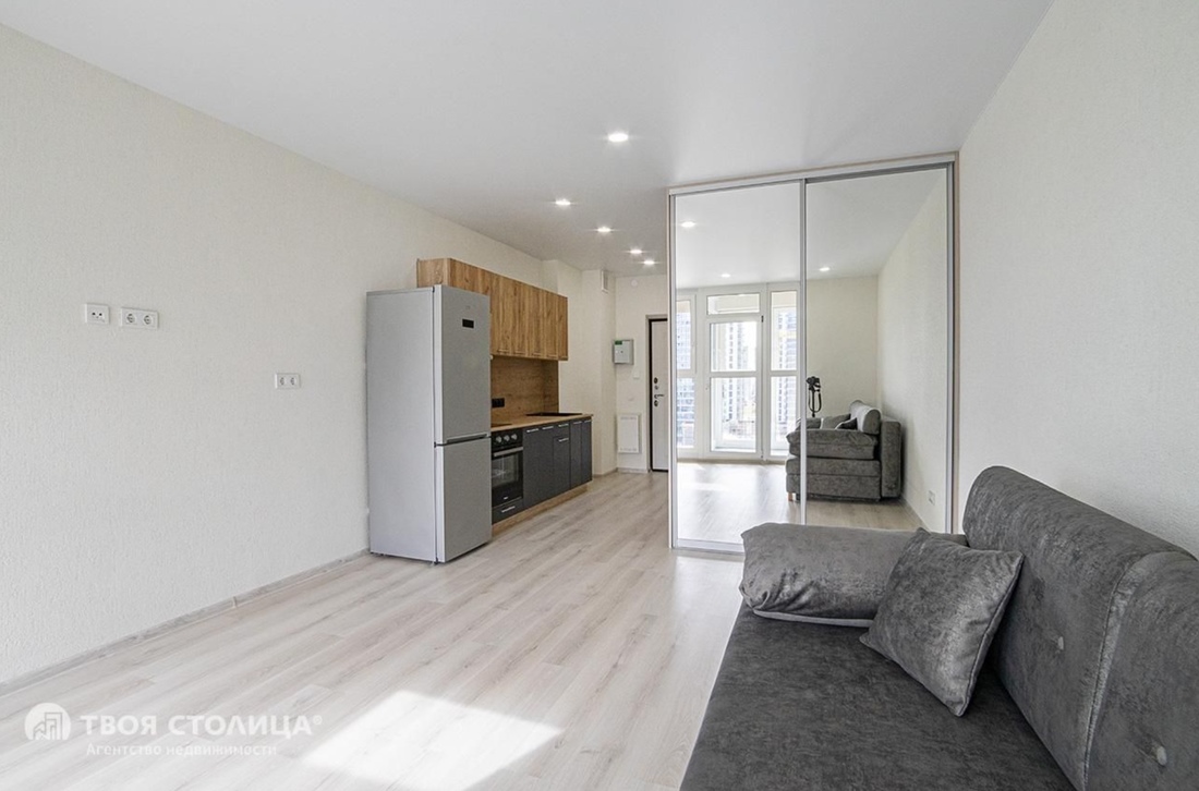 Двухкомнатную квартиру с лаконичным интерьером можно купить за $64 000 в эквиваленте. Она скрывается в доме 2021 года постройки. Площадь — 39 «квадратов». Подразделяется на кухню-гостиную, спальню и совмещенный санузел. Так как объект находится на 22-м этаже, из окон открывается неплохой вид на город.